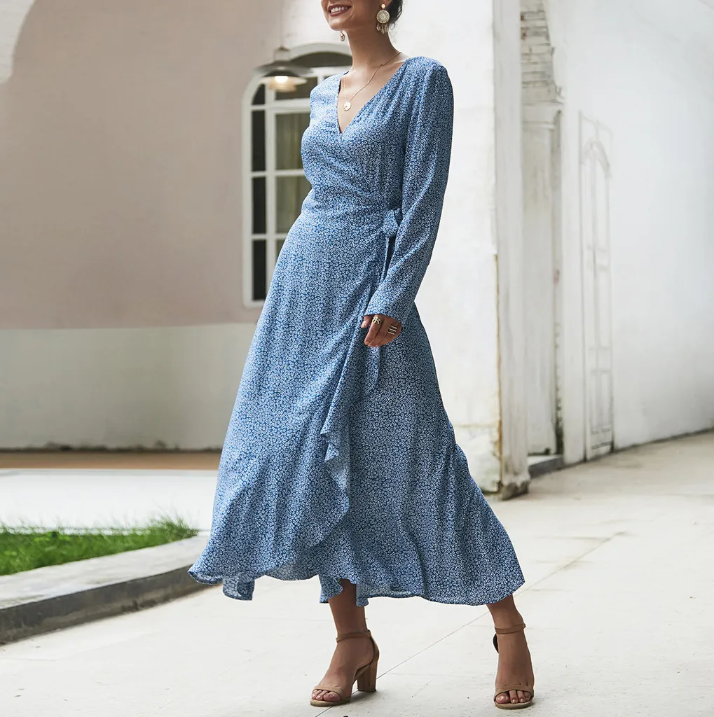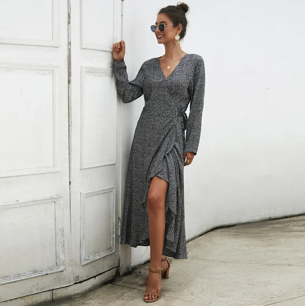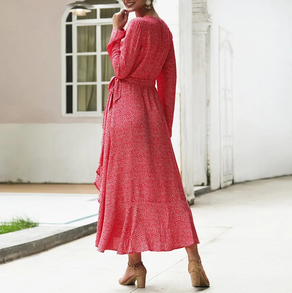 Женское богемное летнее платье с длинным рукавом, цветочное Платье макси с v-образным вырезом