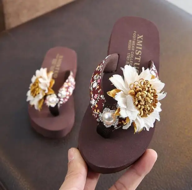 Новые Вьетнамки; Детская обувь; Тапочки с цветами и жемчужинами; Семейные Нескользящие мягкие домашние тапочки для маленьких девочек; Пляжные сандалии; s508