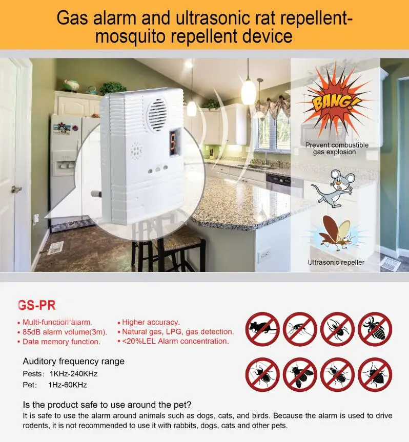 Многофункциональный газовый сигнализатор с ультразвуковой отпугиватель крыс и противомоскитное устройство с вилкой США или английской вилкой US UK детектор газовой сигнализации, LPG/природный газ/детектор угля датчик плагин детектор утечки газа сигнализация со Предупреждение лом и светодиодный дисплей для Дома кухни ресторана отеля школы склада