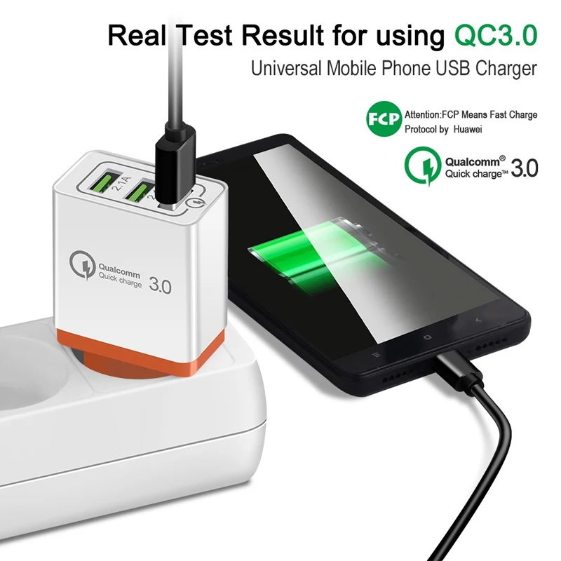 Описание:1. Быстрое зарядное устройство AC USB с 3 портами USB.2. Высокая эффективность и низкое энергопотребление.3. Вход: AC 100-240 V 50/60Hz.4. Выход USB 1:-DC 3,6 V-6,5 V, 3A.-DC 6,5 V-9 V, 2A.-DC 9 V-12 V, 1,5 a.5. Выход USB 2: DC 5 V, 2.1A Макс.6. Выход USB 3: DC 5 V, 2.1A Макс.7. Идеально подходит для дома, офиса, путешествий и других помещений.8. Совместимость: для samsung для sony для htc для Nokia для huawei для lenovo для LG для Blackberry и других устройств, поддерживающих зарядку через USB.Параметры:Разъем: USB 3,0, USB 2,0Материал: АБС-пластикРазмеры: 7,5x4,9x4,4 смВес: 66g