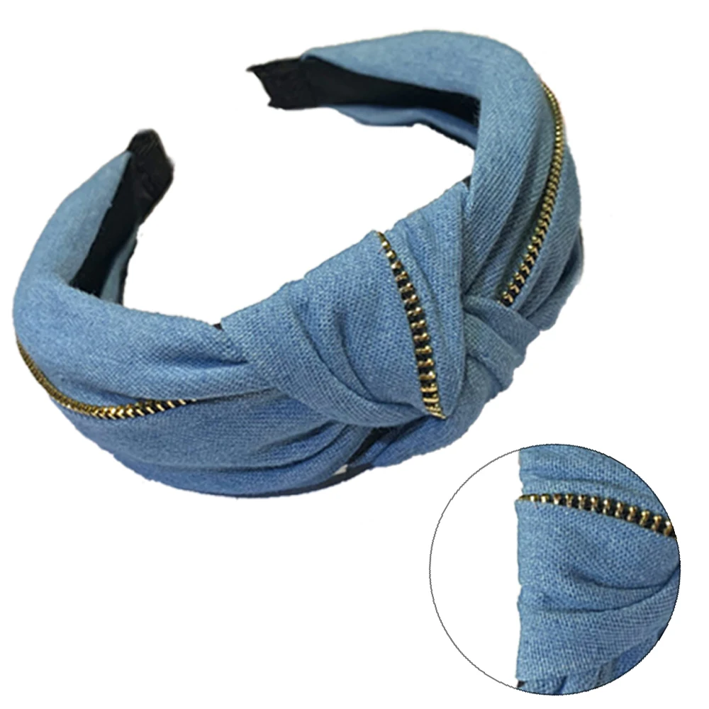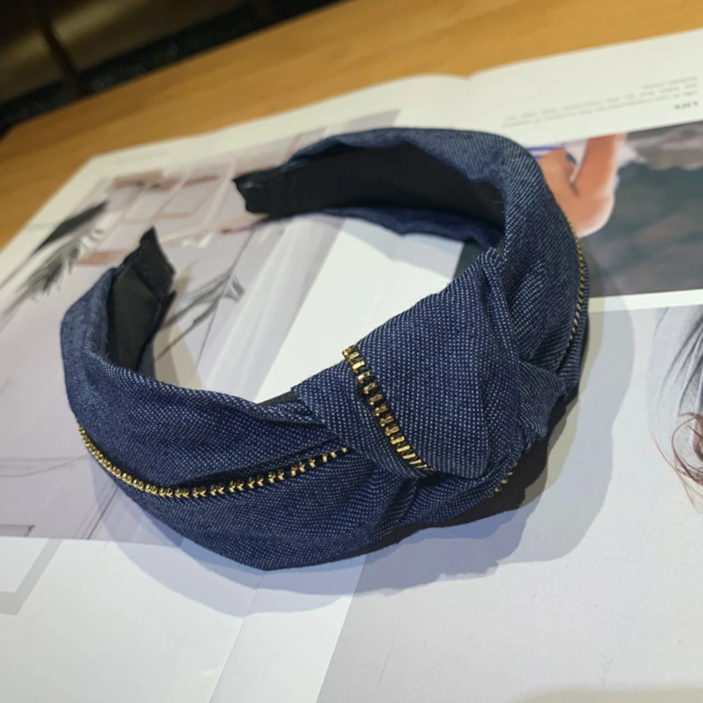 Женский джинсовый ободок на молнии, аксессуар для волос с узелком средней длины, модная синяя повязка на голову, украшение в виде тюрбана