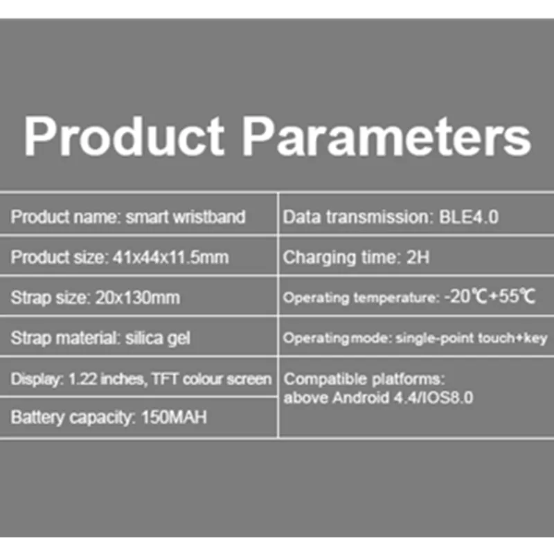 * Системные требования: Android 4,4 и выше, IOS 8,0 и выше, поддержка bluetooth 4,2 * Версия Bluetooth: BLE 4,0 * чип bluetooth: hs6620d * Модуль сердечного ритма Рабочий ток: 30-100 мА * Дисплей: цветной экран 1,22 дюйма * Емкость аккумулятора: 150 мА · ч * Память браслета: 1 м * Разрешение браслета: 240*240 пикс * Время в режиме ожидания: 10-15 дней * Время работы: 7 дней * Физические кнопки: Да * Двигатель: Да * интерфейс зарядки: 2pin * Уровень водонепроницаемости: IP67 * Датчик: трехосевой датчик гравитации