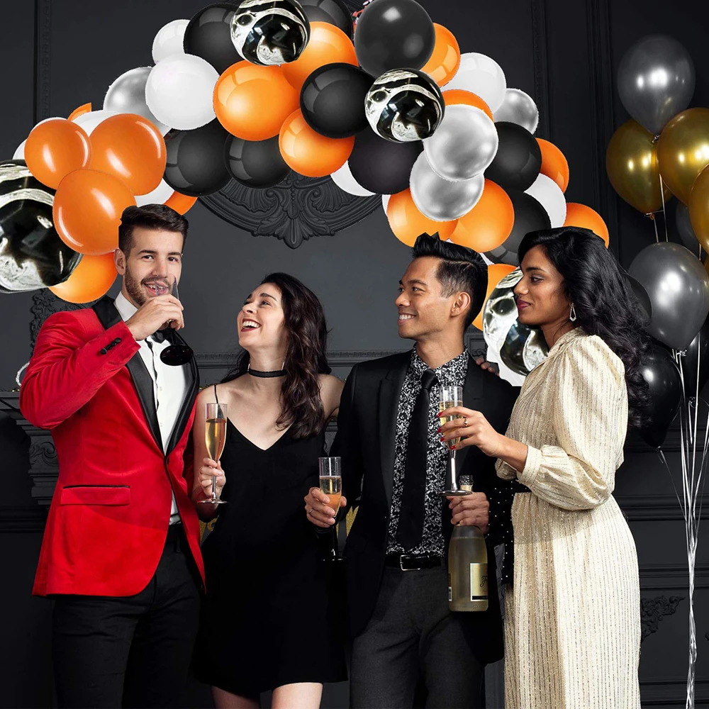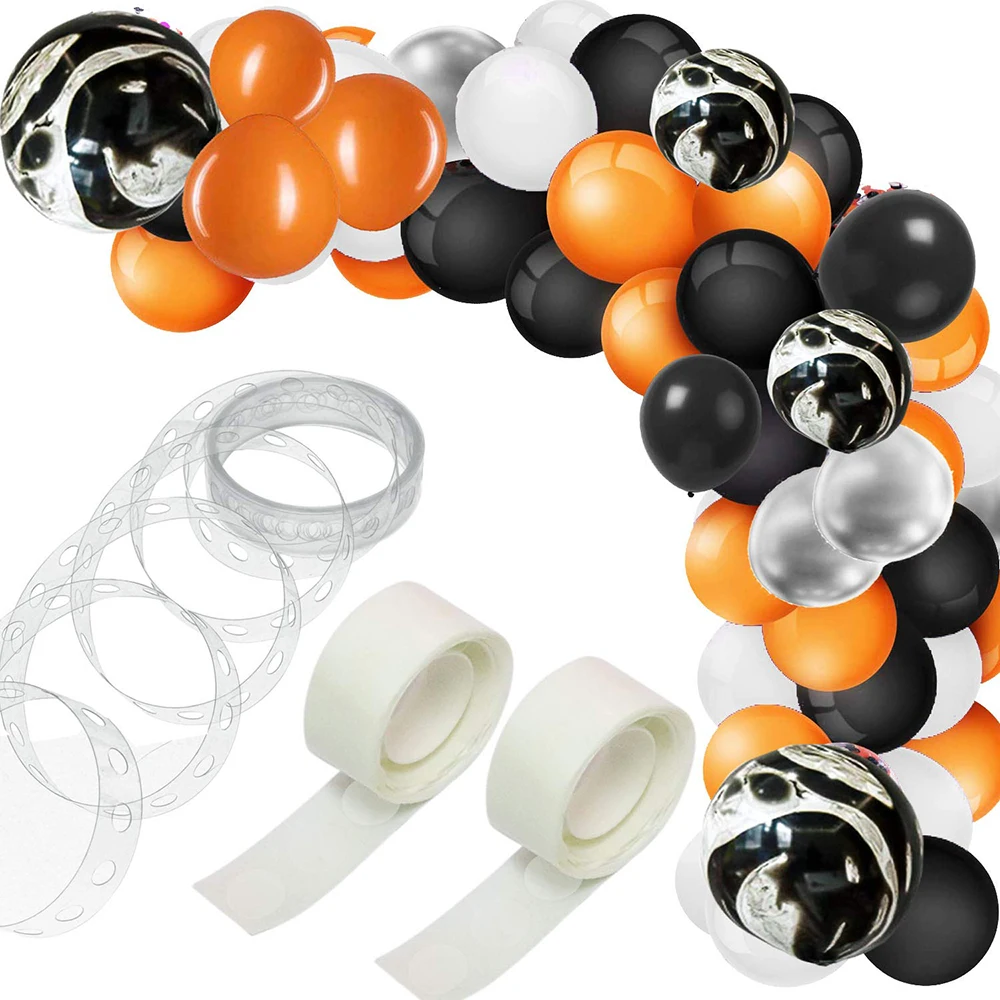 About product ✾【DIY BALLOON GARLAND】-That is the easiest way to create a balloon arch with the plastic strip.Making your own balloons for garland ,easily create a show stopping balloon masterpiece at any of your celebrations! Just blow up your balloons and put them through the hole in the plastic strip and stick the balloons together with the glue points. ❣【BRING YOUR LOVE TOGETHER】- 1 roll of balloon tape strip is 5 m/ 16 feet in length with approx. 270 pieces holes to make your own balloon arch garland. 1 roll of 100 pieces glue points, sticky and invisible. Two props to keep your balloons together , to form a bigger love, more beautiful to decorate your activities. ღ【WIDE-APPLICATION】-Halloween balloon arch is perfect for baby showers, weddings, graduations, anniversaries, corporate Events, engagements, BBQs, bridal shower, festivals celebration, photo booth backdrop and more. ♛【PAKAGE INCLUDE AND SIZE SUGGESTION】- Each set balloon arch kit includes 8pcs 12 inch Agate black balloon, 40pcs 10 inch black balloon, 12pcs 10 inch Silver balloon, 20 pcs 10 inch white balloons and 40 pcs 10 inch orange balloons. And with 1 roll of balloon tape strip, 2 roll of 100 pieces balloon glue point dots , 123 pieces in total.