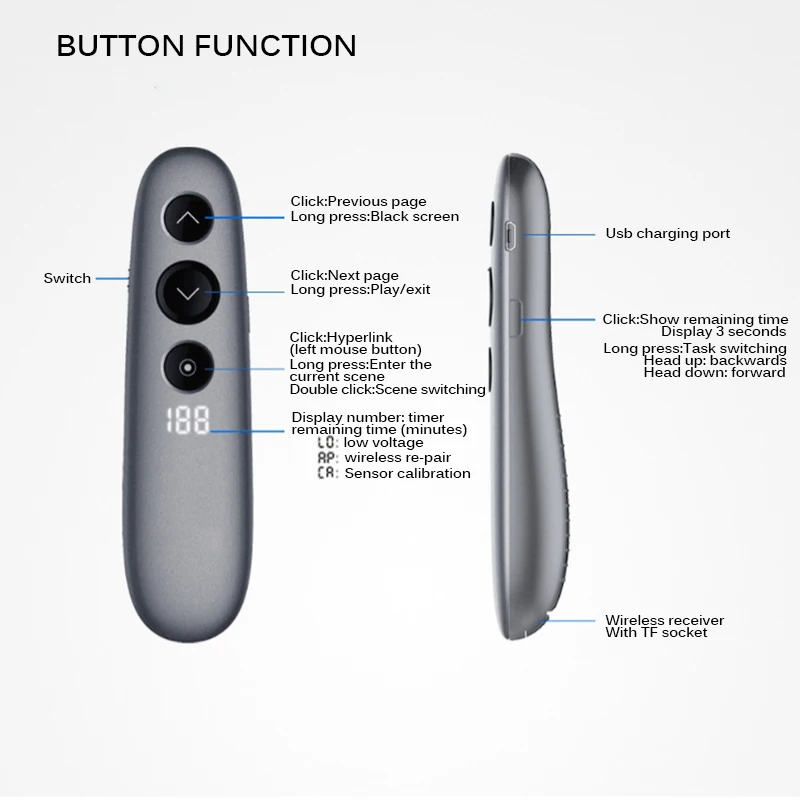 Presentation clicker combines the functions of mouse-like wireless cursor control (to play video, open links etc.), anti-lost reminder, timer, switch windows, full/ black screen, page up, page down.
