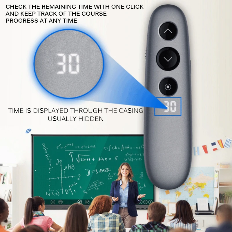 The laser pointer has initiative anti-lost function and built in timer efforts to present without concern about presentation timing. Vibrates in your hand makes for silent awareness of time (max time: 199min).
