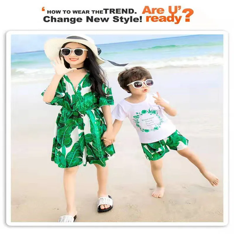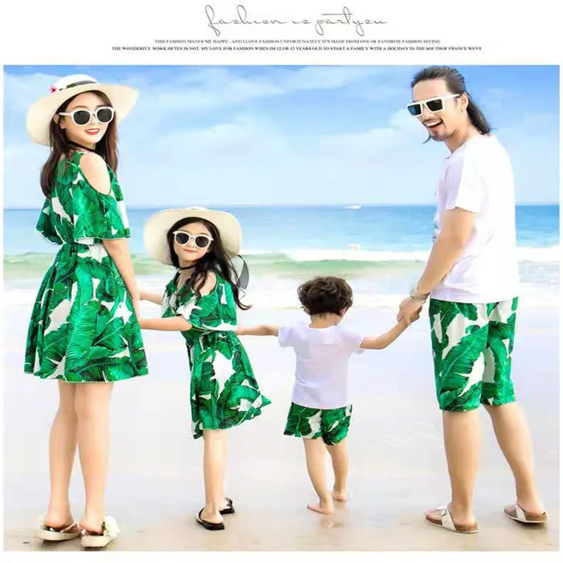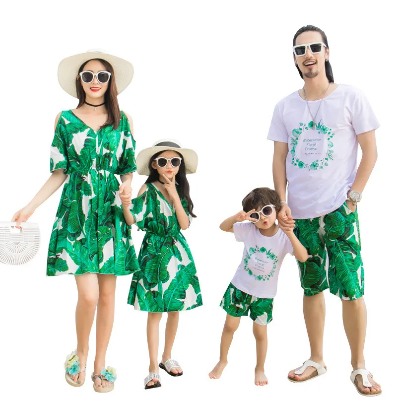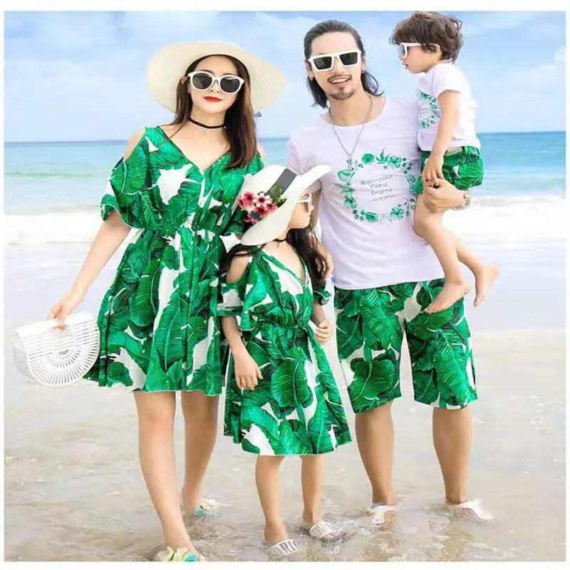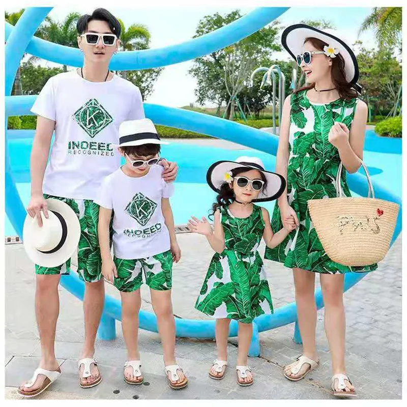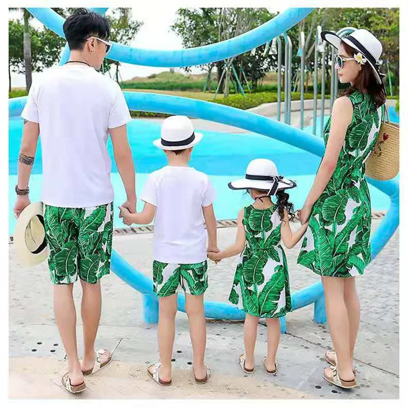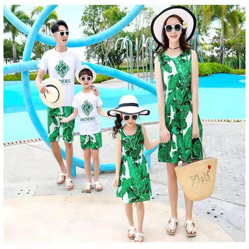 2019 одинаковые комплекты для семьи летнее модное зеленое платье с цветочным рисунком платья для мамы и дочки одежда для папы и сына, шорты