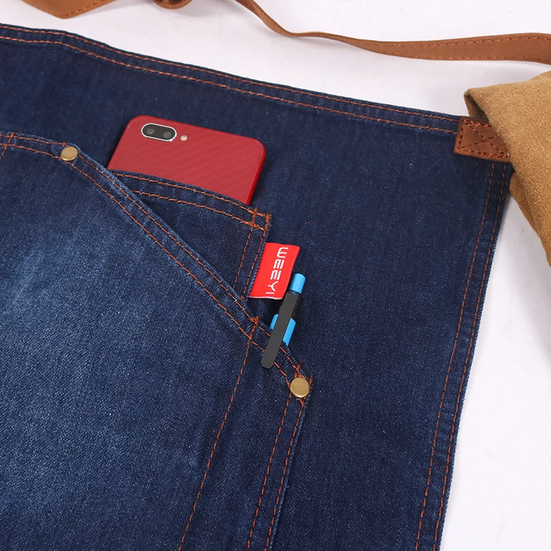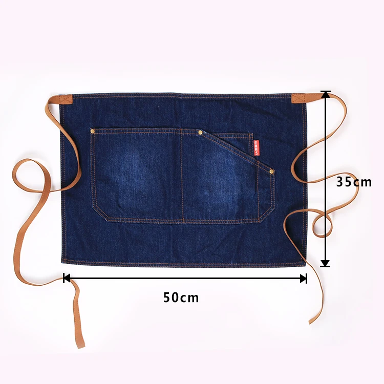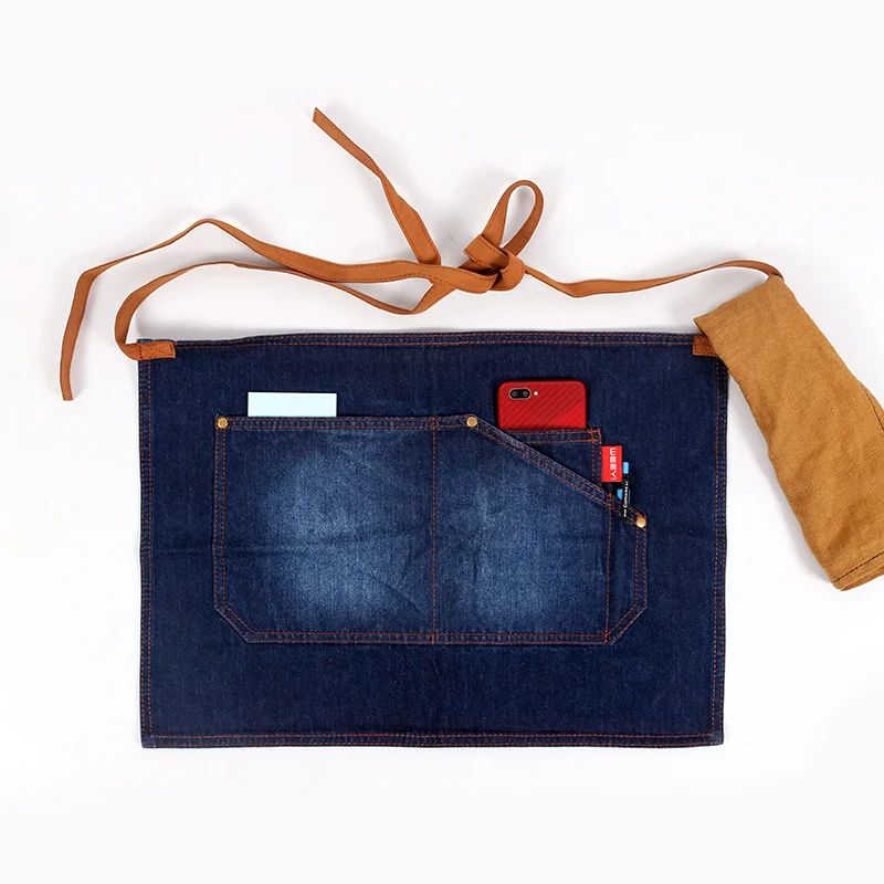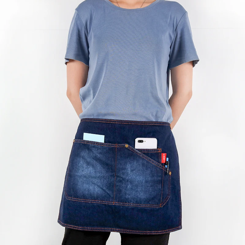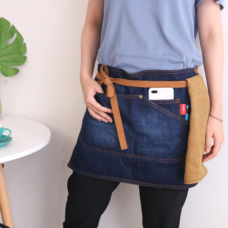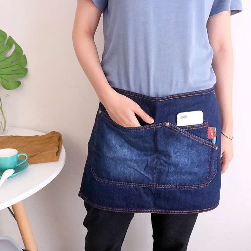 Синий фартук для ресторана WEEYI, Кухонный Фартук для шеф-повара, джинсовый фартук с короткой талией, Бытовой Фартук для уборки, бант с карманами