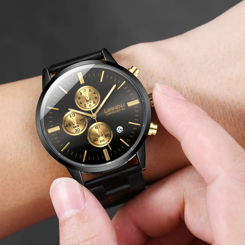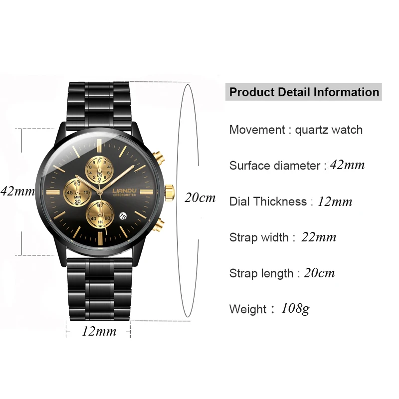 Диаметр корпуса: 43 мм прибл. Толщина корпуса: прибл. 12 мм Длина ремешка: прибл. 20 см. Ширина ремешка: приблизительно 22 мм Все размеры измеряются вручную, что может немного отличаться. Подробная информация соответствует окончательным продуктам. Особенности: 1. Водонепроницаемость до 99 футов (30 м). 2. 3 суб-циферблата и окно календаря все функциональны. 3. 12 месяцев заводской гарантии. Компоненты включает в себя: 1 х Оригинальные кварцевые часы LIANDU 6025 Фотографии: Внимание: то, что вы видите на картинке, абсолютно то, что он есть, вы можете почувствовать некоторую разницу в цвете под монитором и камерой, пожалуйста, обратитесь к материалу.