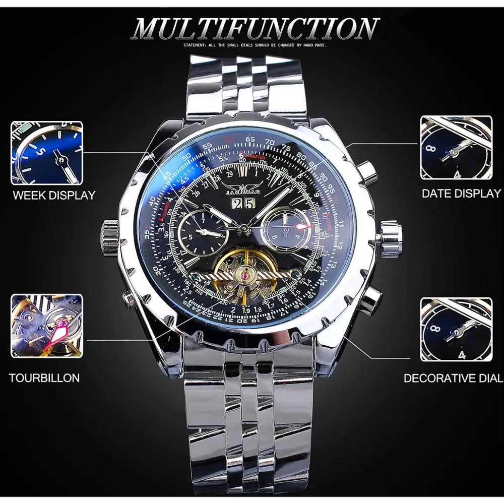 -Корпус часов из нержавеющей стали и ремешок часов делают часы более прочными.-Дизайн циферблата Tourbillon показывает вашу модную точку зрения.-Автоматическая обмотка механического механизма позволяет носить часы в любое время.-Цвет может не выглядеть точно так, как в реальной жизни из-за различий между компьютерными мониторами и небрежным глазом разница в цвете. Спецификация:-Диаметр: 48 мм-Толщина: 16 мм-Длина ремешка часов: 21 см-Ширина ремешка: 24 мм-Механизм: механический с автозаводом-Ремешок часов: нержавеющая сталь-Корпус часов: нержавеющая сталь Посылка включает в себя:-1 х механические часы-1 х маленькая картонная подарочная коробка Для пульта дистанционного управления1. Пожалуйста, снимите все пленки перед использованием.2. Пожалуйста, держите часы подальше от магнита, чтобы часы не переставали работать.3. Пожалуйста, заводите часы перед каждым использованием.См. также другие товары: 8884000163132981, 8884000163132982, 8884000163132984, 8884000163132985