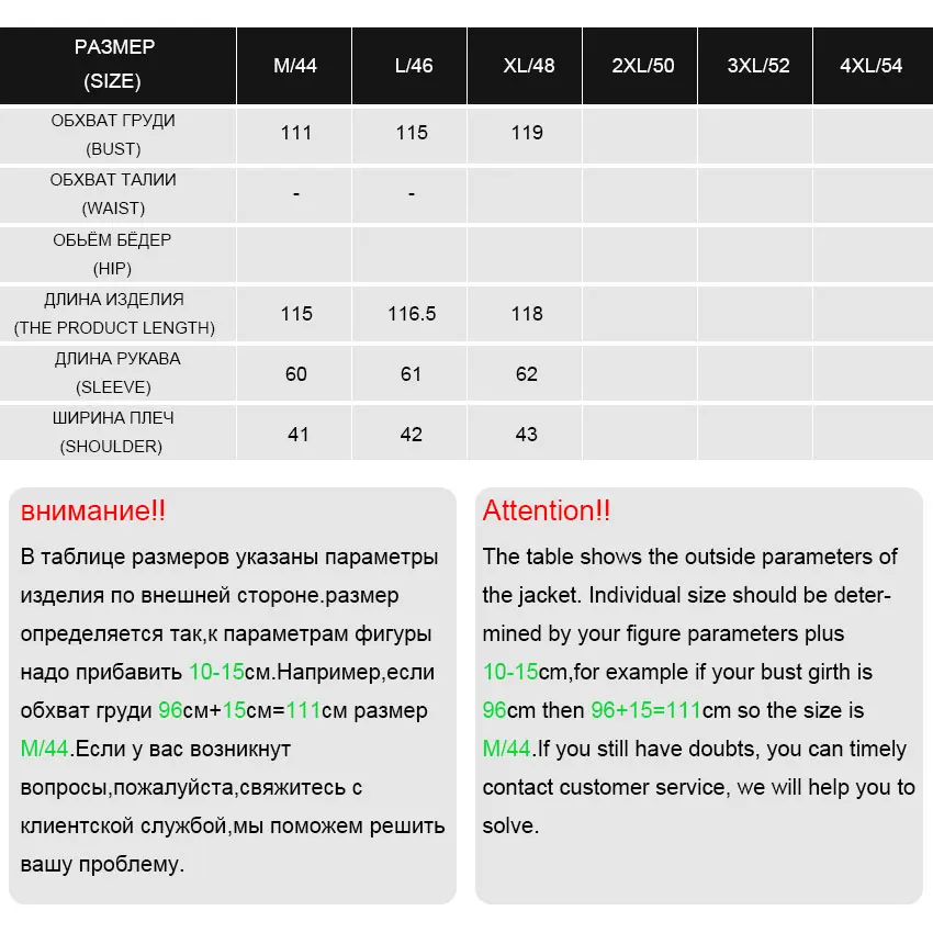 1. При выборе размера необходимо учитывать обхват груди в качестве основного эталонного стандарта (за исключением нестандартного роста). Поскольку наша продукция-это зимние пальто, при выборе размера рекомендуется добавить 10-15 см на основе окружности груди в соответствии с привычкой носить, затем выберите соответствующий размер в отличие от Таблицы размеров. 2. Существует другой метод, вы также можете выбрать свою аналогичную одежду, измерить ее размер, затем взять этот размер в качестве стандарта, и выбрать правильный размер в отличие от Таблицы размеров. 3. Если у вас все еще есть сомнения, вы можете своевременно связаться со службой поддержки клиентов, мы поможем вам решить проблему.