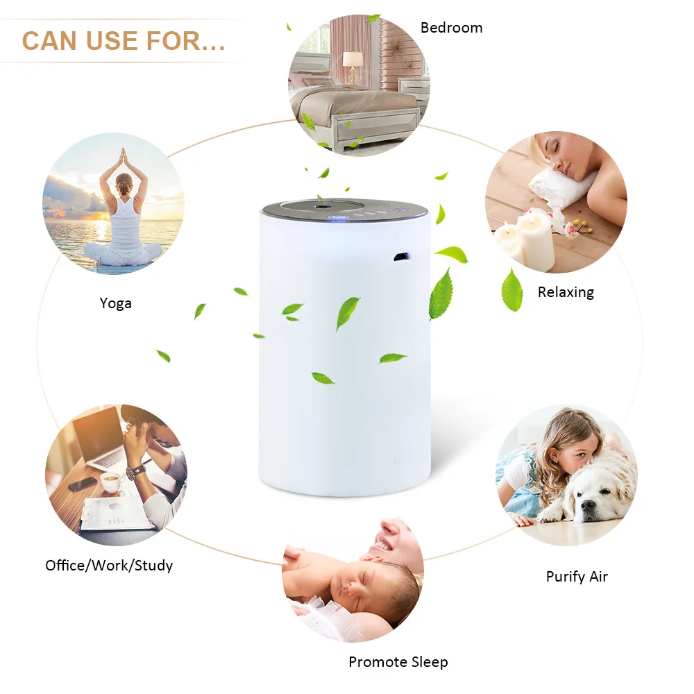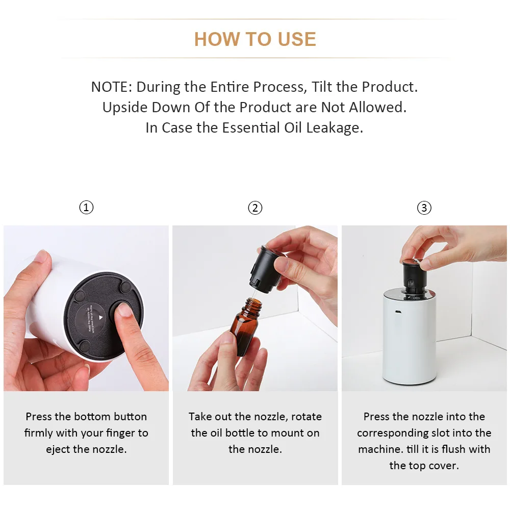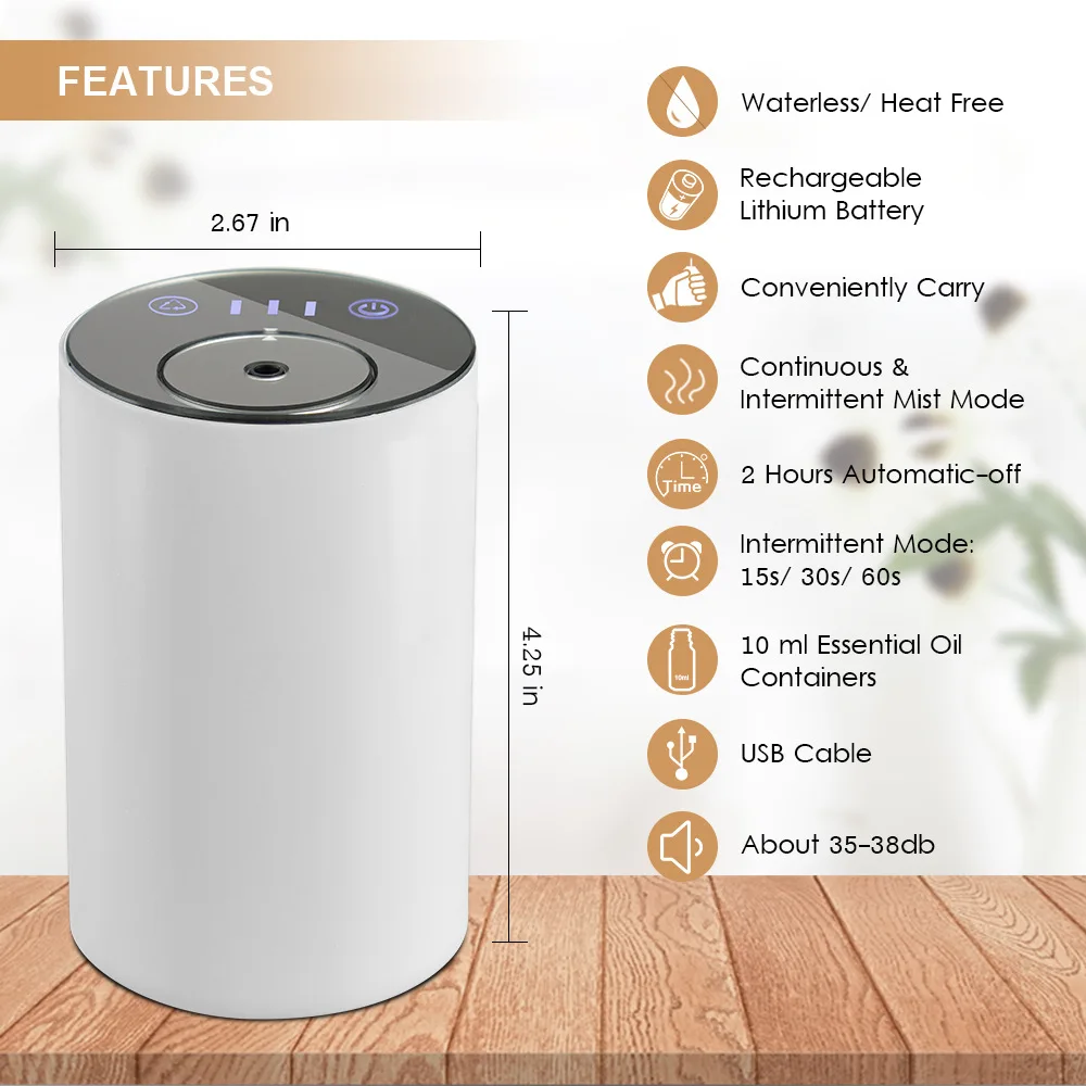 * Adopting air pumping technology, preserving the properties of essential oils; * Add essential oils directly, physical diffusion without heating and water; * The top cosmetic mirror design is well received by women; * Built-in 2200 mAh lithium-ion battery, portable for many occasions and spaces; * Detachable nozzle, easy to clean and change different essential oils; * Three intermittent modes (15s on-165s off; 30s on-150s off; 60s on-120s off); * This diffuser has the function of timing. It will auto-off after running in any intensity for 2 hours.