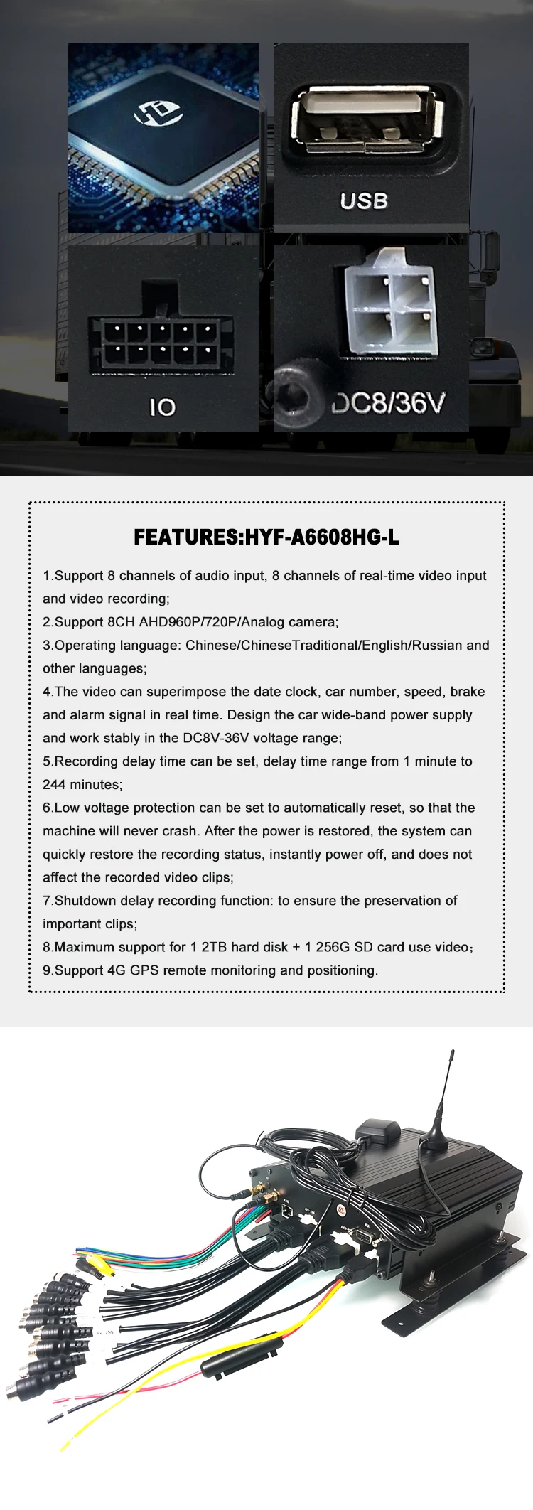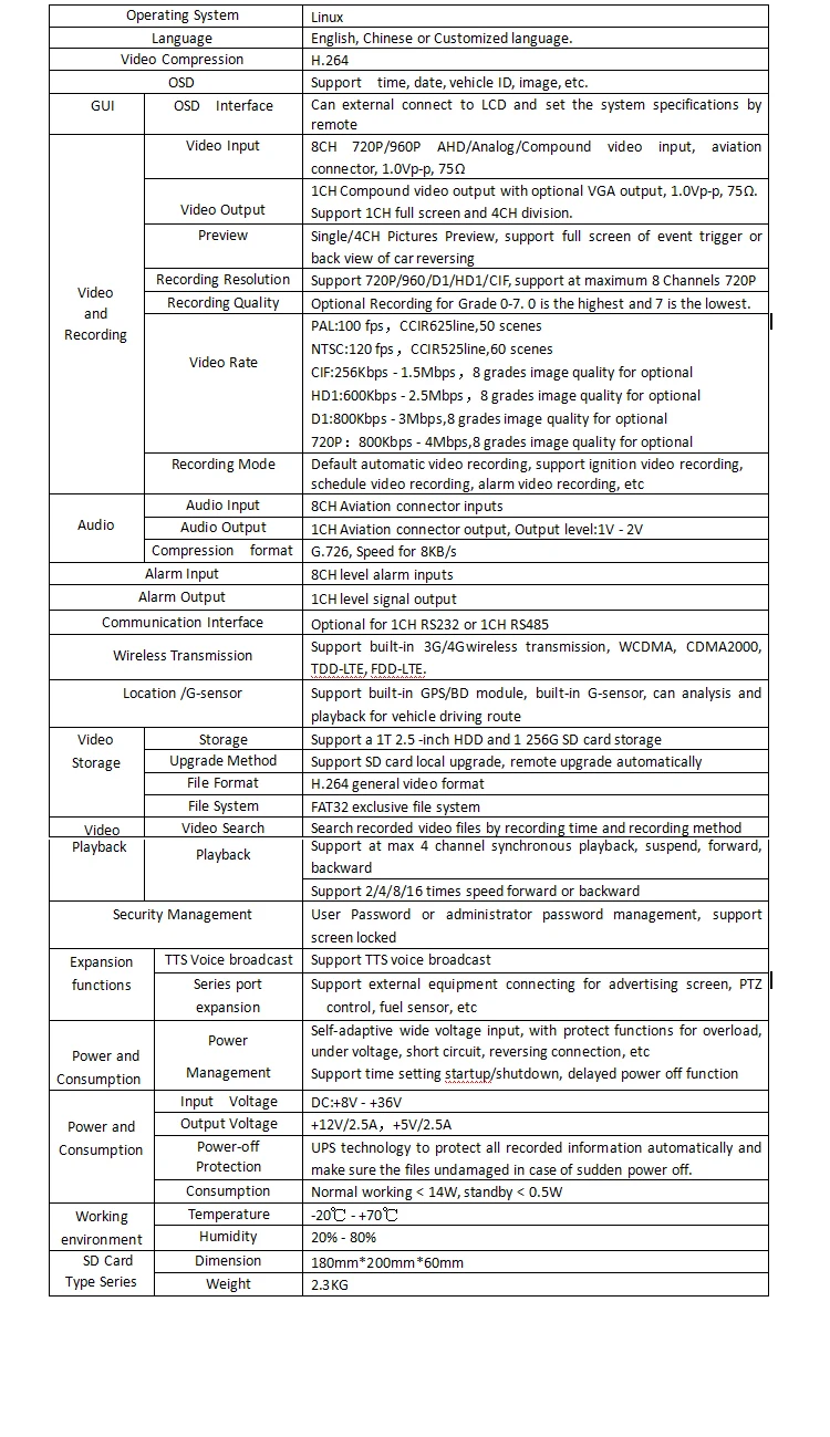 Support 8 channels of audio input, 8 channels of real-time video input and video recording; Support 8CH AHD960P/720P/Analog camera; Operating language: Chinese/ChineseTraditional/English/Russian and other languages; The video can superimpose the date clock, car number, speed, brake and alarm signal in real time. Design the car wide-band power supply and work stably in the DC8V-36V voltage range; Recording delay time can be set, delay time range from 1 minute to 244 minutes; Low voltage protection can be set to automatically reset, so that the machine will never crash. After the power is restored, the system can quickly restore the recording status, instantly power off, and does not affect the recorded video clips; Shutdown delay recording function: to ensure the preservation of important clips; Maximum support for 1 2TB hard disk + 1 256G SD card use video; Support 4G GPS remote monitoring and positioning. Specifications