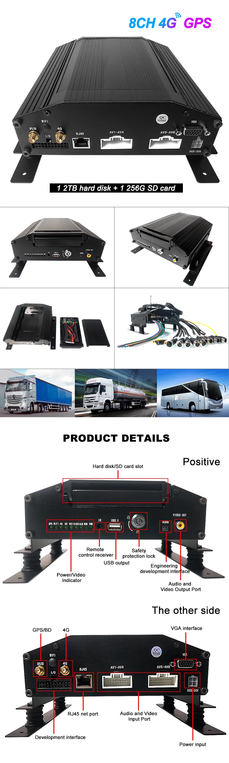 1.Supporting 1 256G SD cards 2.Support 1 2TB hard disk 3.Supporting 4G/GPS remote monitoring and positioning
