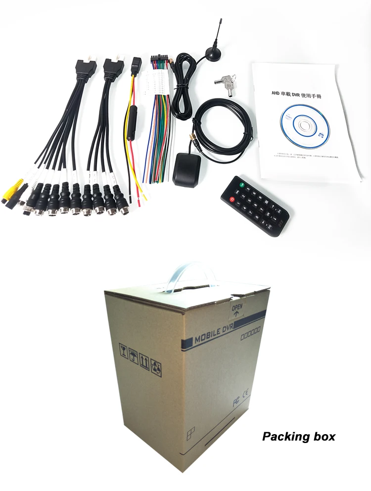 MDVR+ Audio and video cable*2 + power cord + IO trigger cable + 4G antenna + GPS antenna + CD + remote control + key + manual