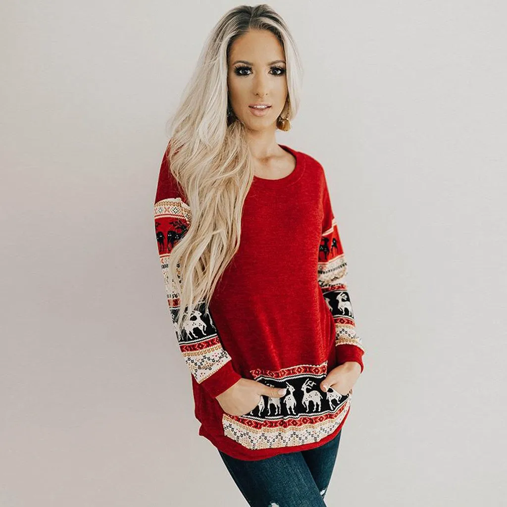 Женская рождественская красная Праздничная Толстовка с принтом, пуловер с карманами, топы, блузка