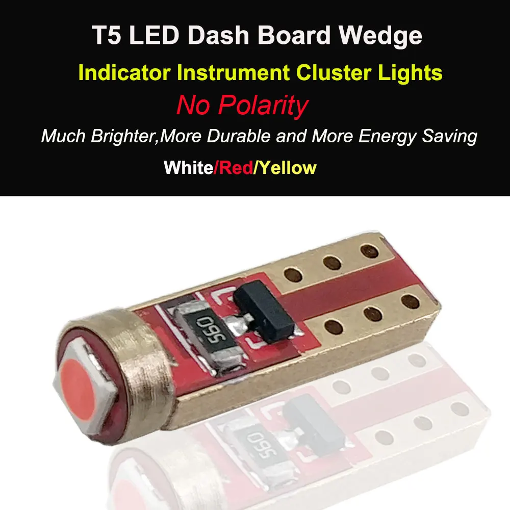 Особенности: Тип гнезда: светодиодный T5, без полярности Тип чипа, светодиодный, автоматический, 3030 светодиодный Светодиодный чип Q'ty для автомобилей, лампа: 1 светодиодный чип Материал корпуса: алюминиевый сплав Цвет: белый, красный, янтарный Угол луча: 360 градусов Мощность: 1 Вт Напряжение: 12 В постоянного тока Световой поток: 100 лм Водонепроницаемый: IP65. Срок службы: 50000 часов T5-Перекрестная ссылка: 74 = 17 18 37 70 73 79 85 86 2721 Использование: приборные панели, калибровочный кластер, контрольный индикатор двигателя, индикатор дальнего света, фонари переключения передач. Применение: Подходит для автомобилей, мотоциклов, велосипедов, лодок, других автомобилей, автофургонов .... Посылка 2x T5 светодиодный свет