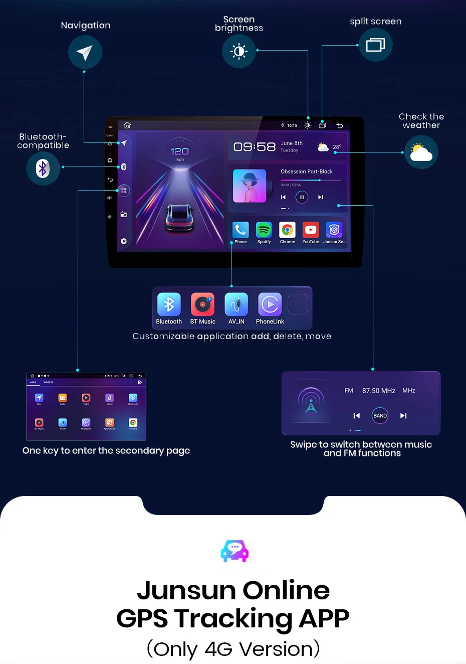 Приложение «Junsun Online», вы можете проверить информацию о отслеживании и месте парковки на своем телефоне; Более того, если вы покупаете специальный видеорегистратор, вы можете сфотографировать, что происходит рядом с вашим автомобилем; делает вашу поездку безопасной, веселой и удобной.