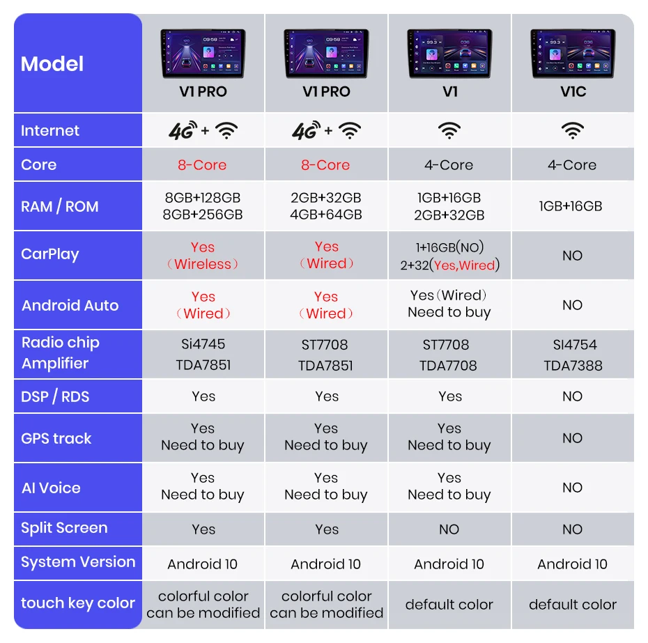 2. Встроенный Carplay/ Android авто: версия V1/V1Pro поддерживает, просто используйте кабель для подключения телефона, стабильный и простой в использовании;