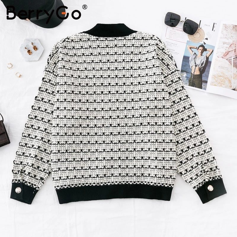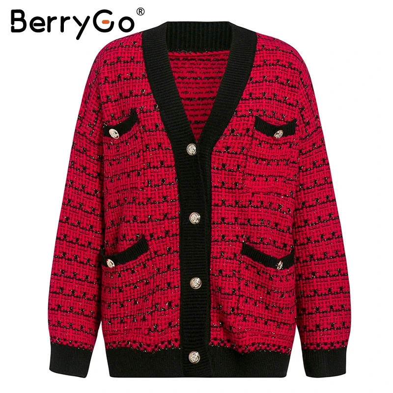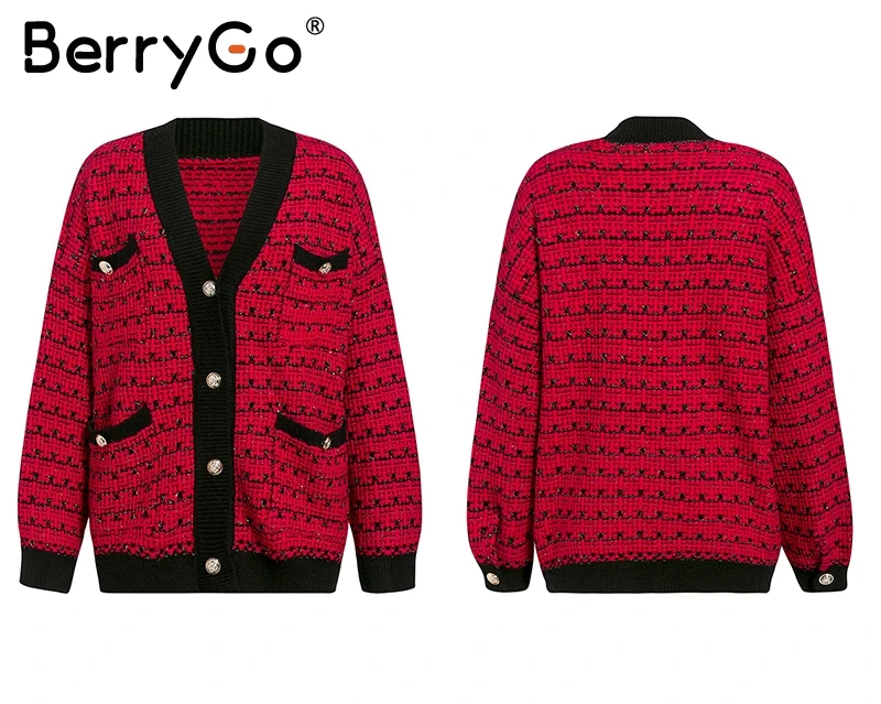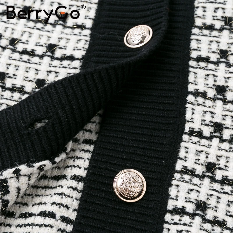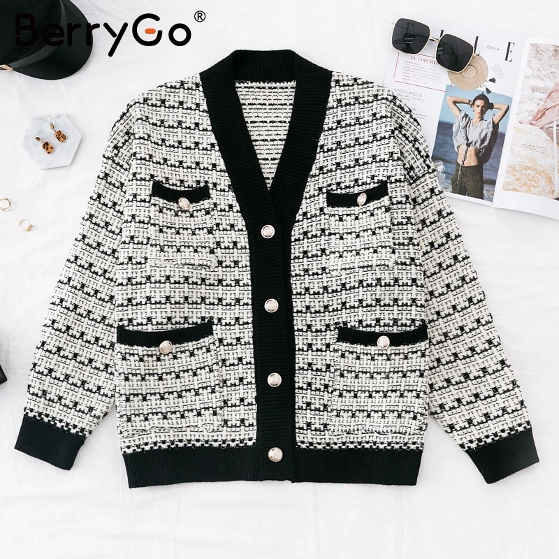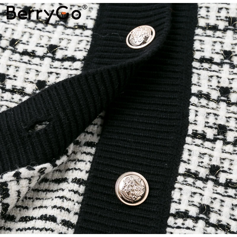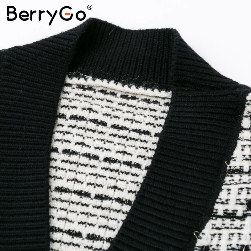 BerryGo элегантный хлопковый клетчатый вязаный кардиган свитер женский сексуальный v-образный вырез офисный женский кардиган однобортный fem