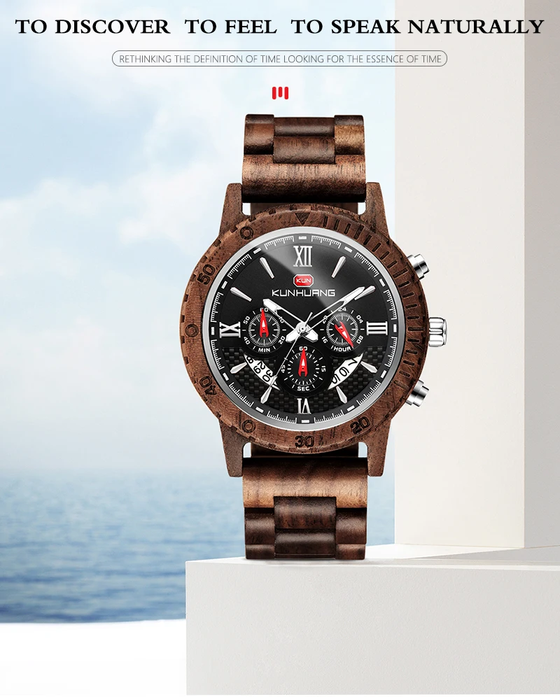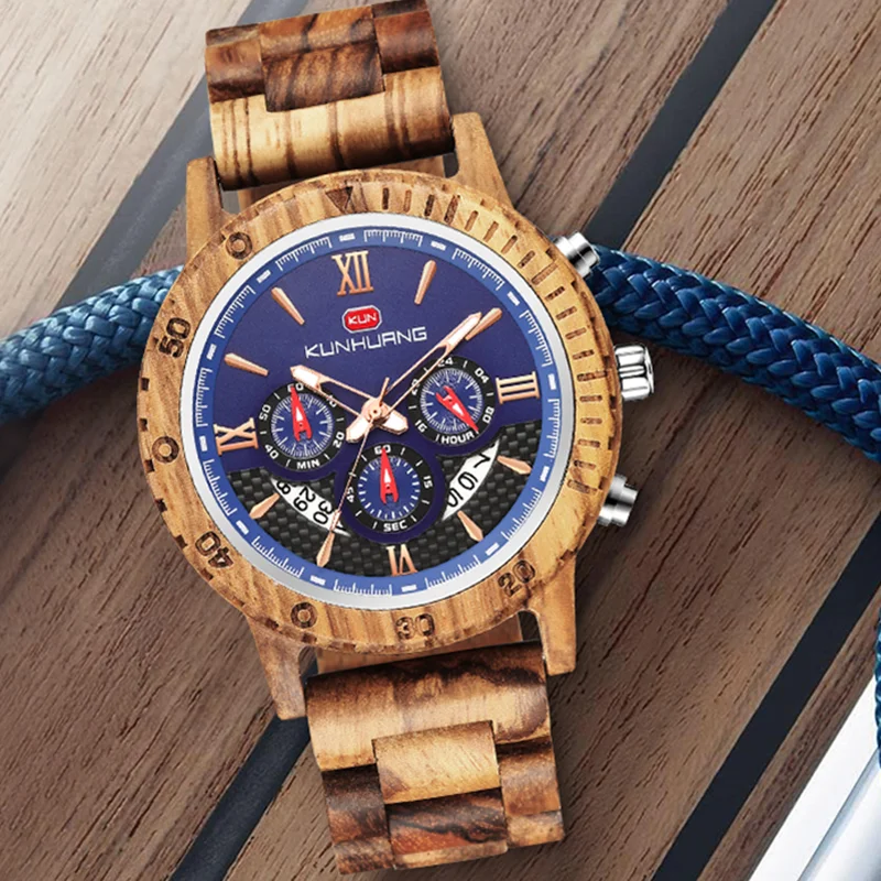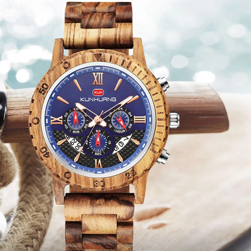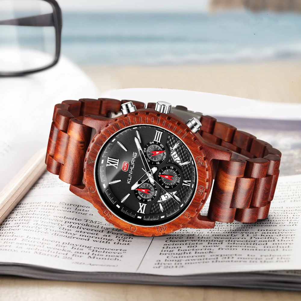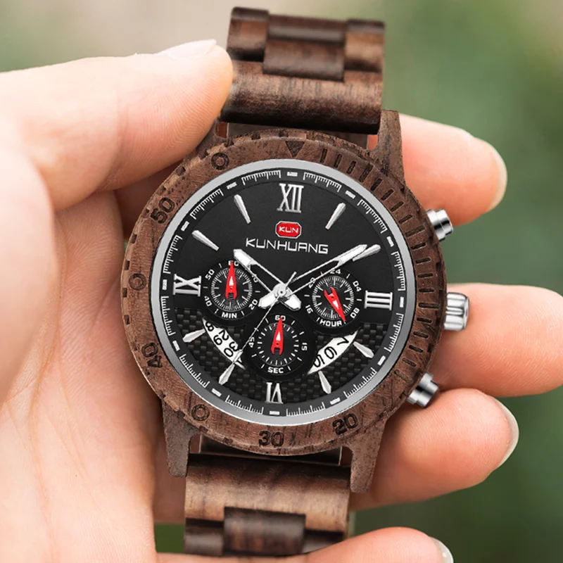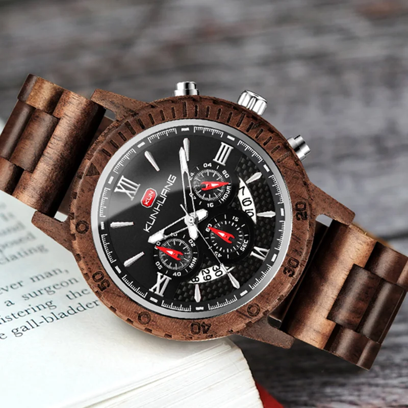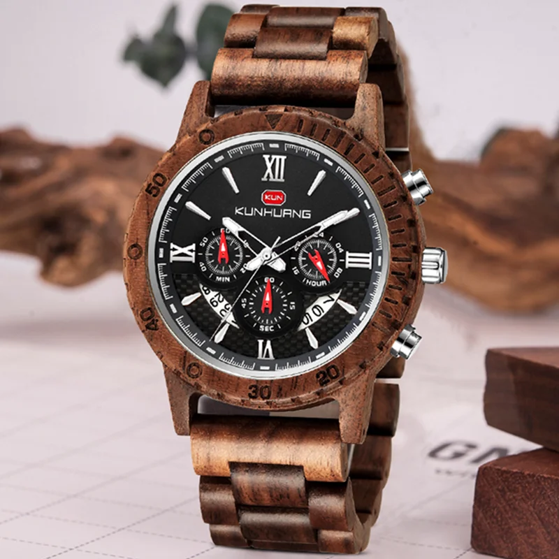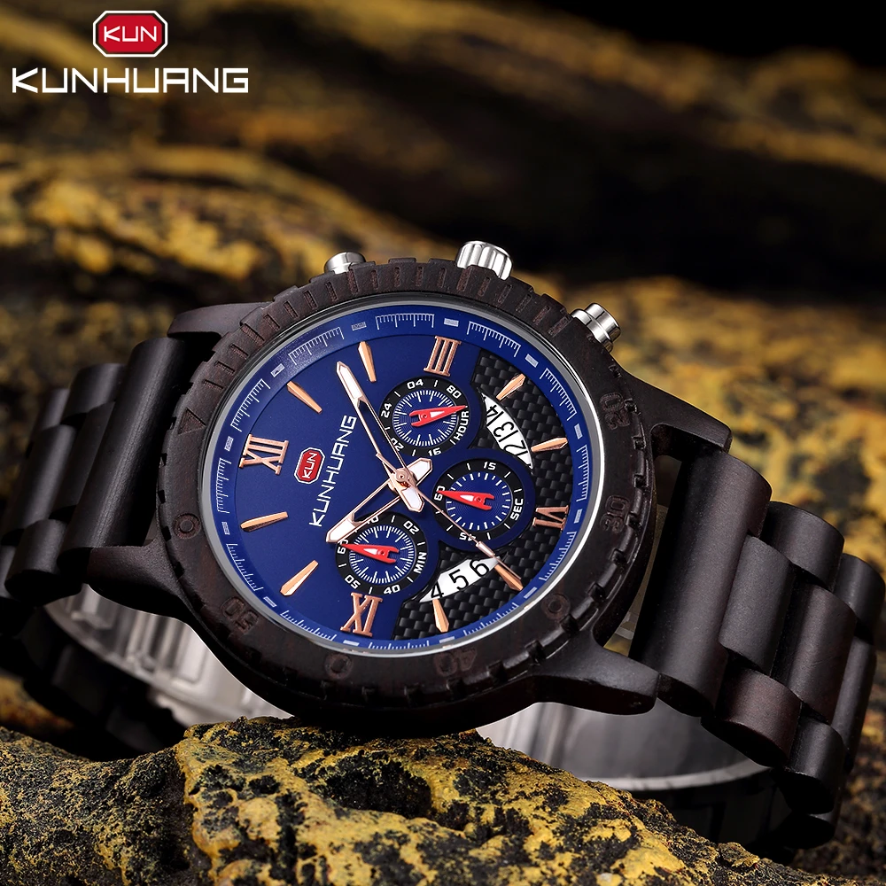 KUNHUANG хронограф деревянные часы для мужчин Relogio Masculino большой циферблат спортивные наручные часы черный черное дерево мужские часы Reloj Hombre