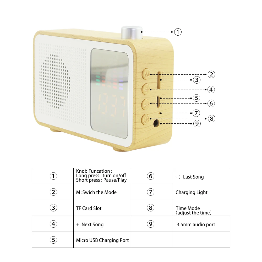 • Многофункциональная Аудиосистема: поддержка звука HD CD, музыки, радио, воспроизведения карт TF, поддержка подключения bluetooth, синхронизации будильника, входа AUX