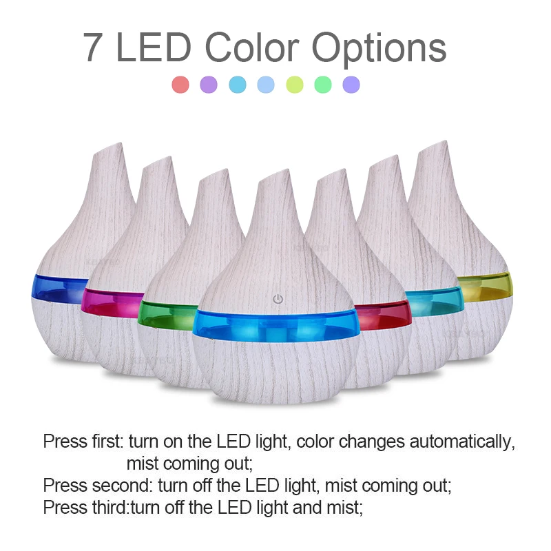 Параметры Емкость: 300 мл Время работы: ~ 6 ч Мощность: ~ 5 Вт Светодиодный светильник: 7 цветов светодиодный Цикл Шум:<35 дБ (A) Onput:DC 5V/1A Туман: ~ 35 мл/ч Вес: ~ 225 г Размер: 110*155 мм Площадь использования: ~ 10-40m2