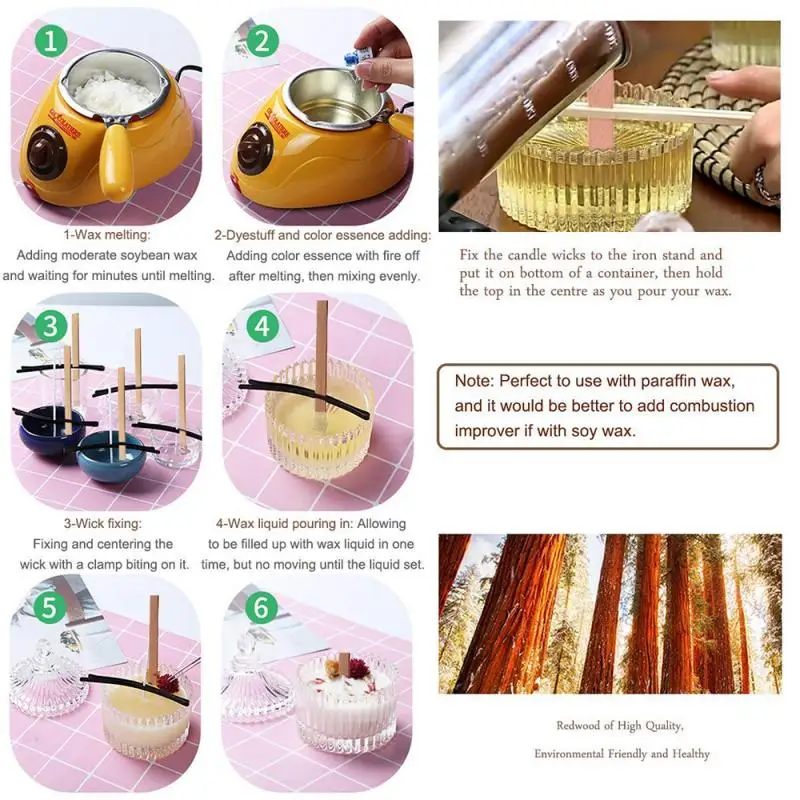 Прост в использовании. Прикрепите свечу к железной подставке и положите ее на дно контейнера, а затем Удерживайте верхнюю часть в центре, пока вы заливаете воск. Когда он остынет, у вас будет красивая свеча для вас и вашей семьи.