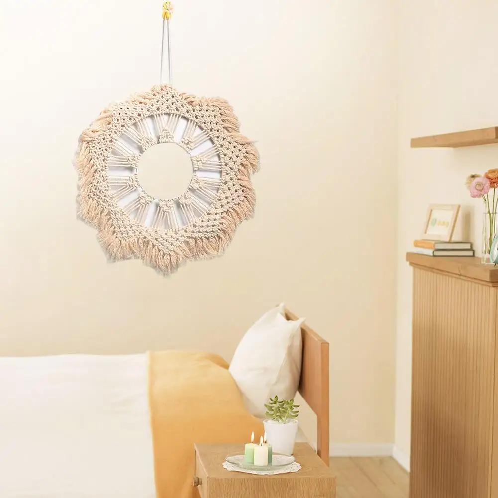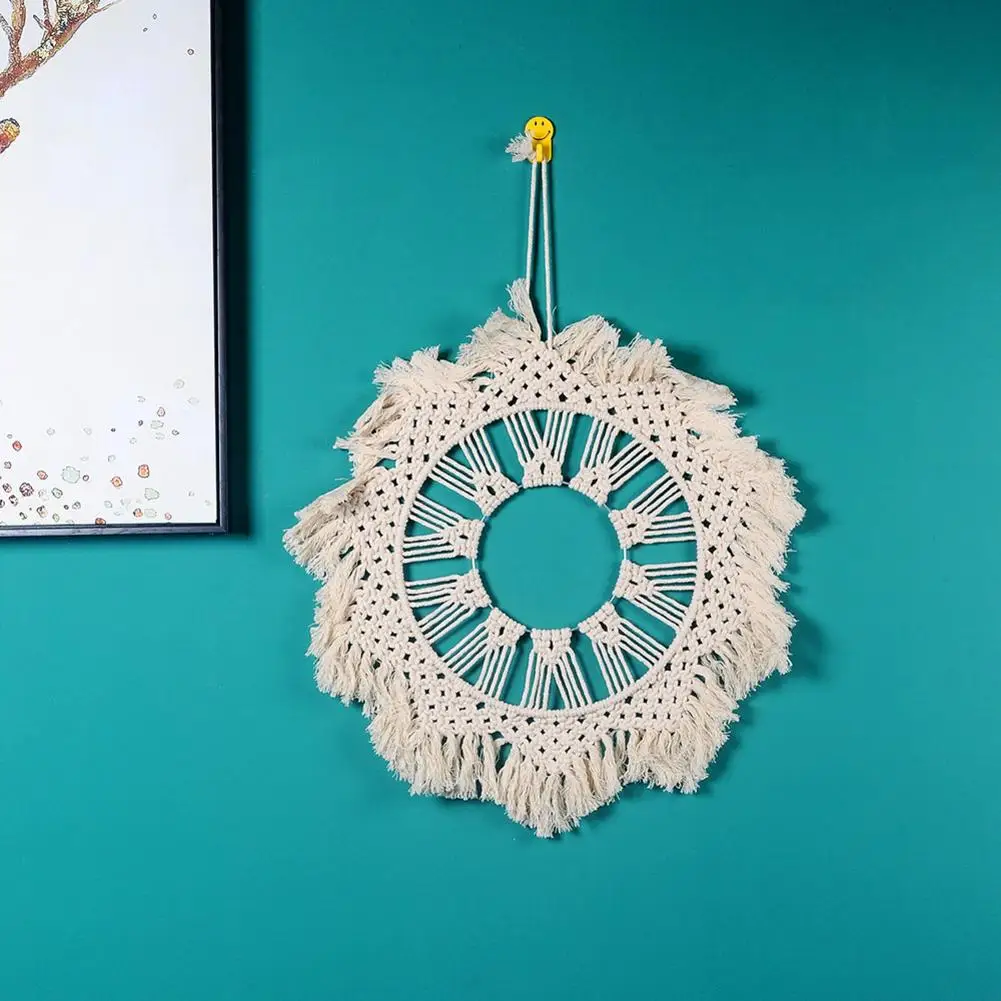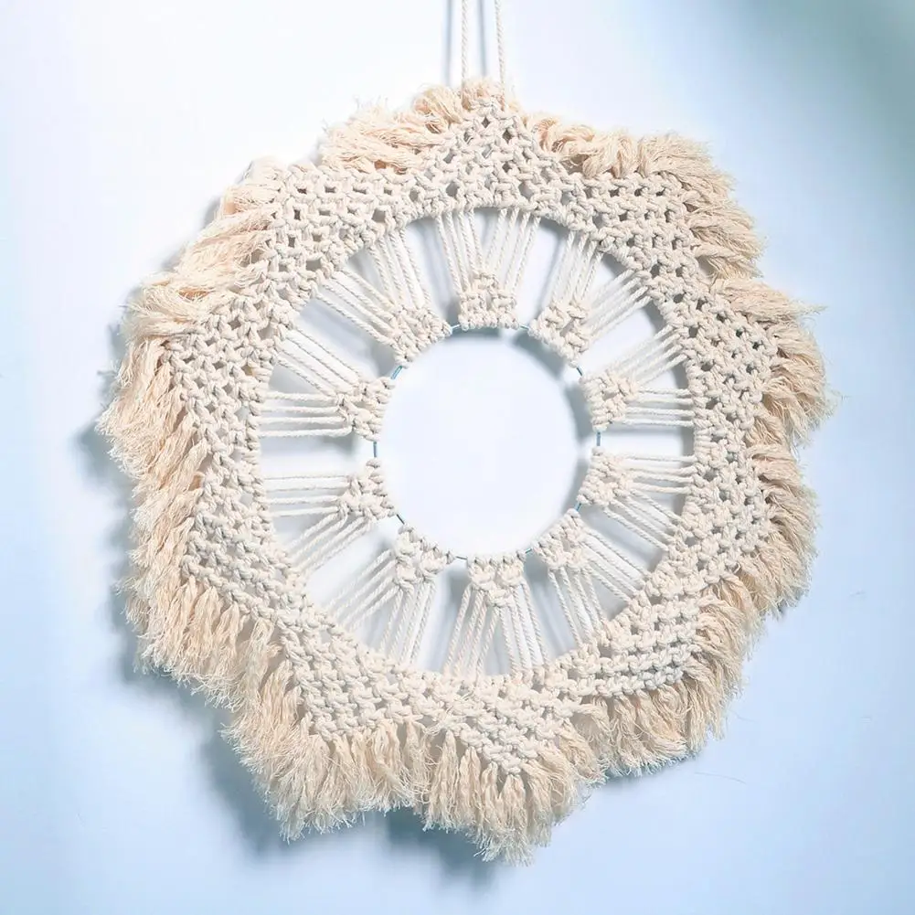 Ручной работы из хлопчатобумажной веревки полое кольцо, около 48 см в диаметре, и гобелен