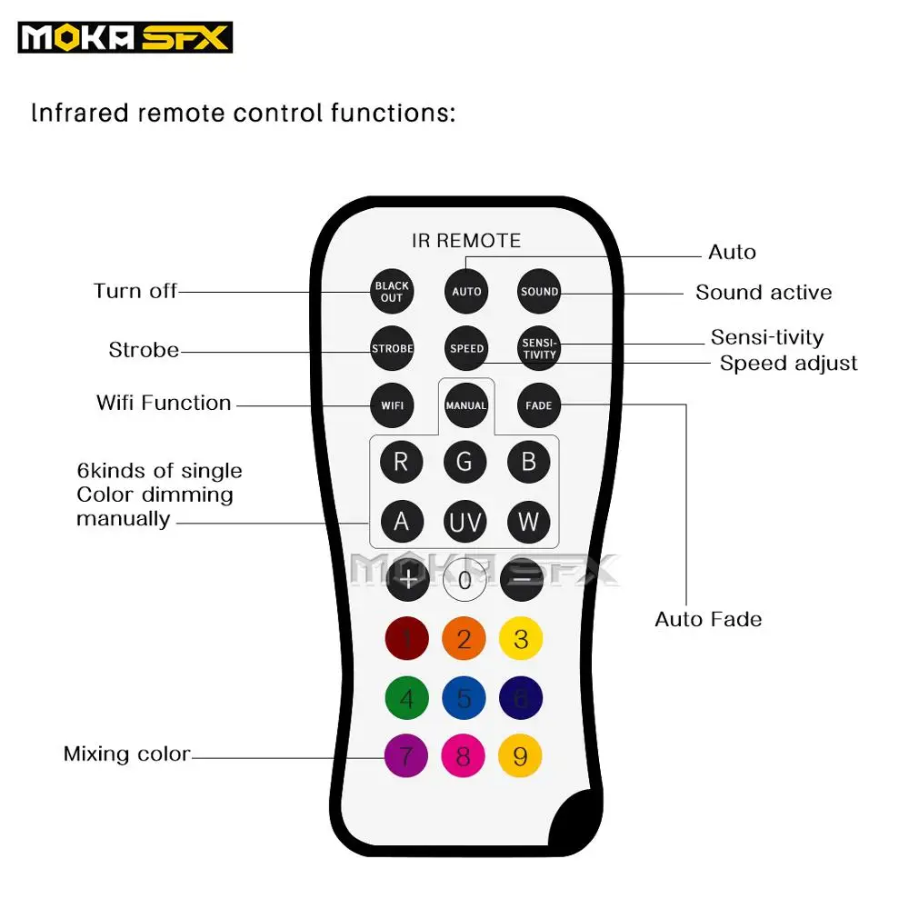 Режим управления: Wifi IOS или Android, 2,4G беспроводной dmx, DMX512, master/slave, auto, sound active, (ИК пульт дистанционного управления опционально)