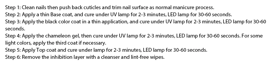 Step 5. Apply the chameleon gel, cure with UV lamp for 2-3 minutes or cure with LED lamp for 30-60 second; when dry, apply the 2nd layer and cure with UV lamp or LED lamp again.