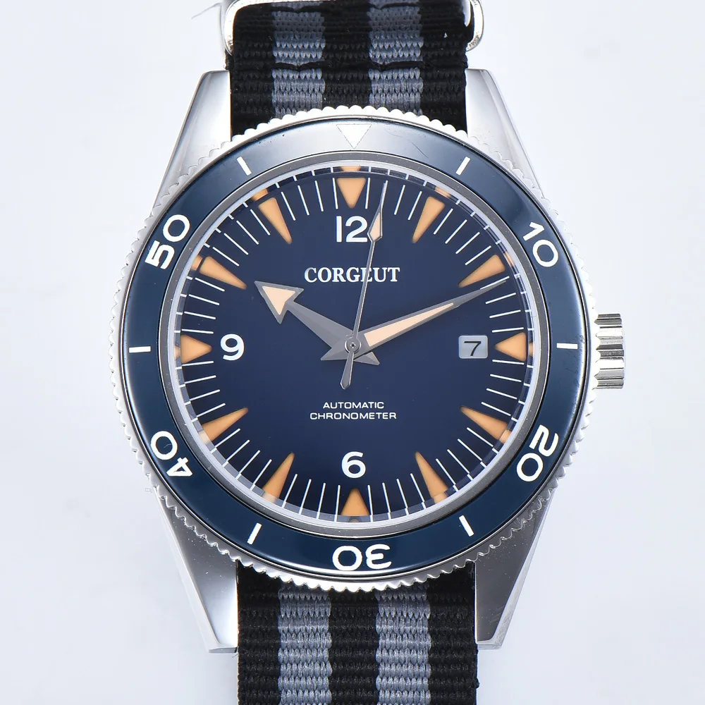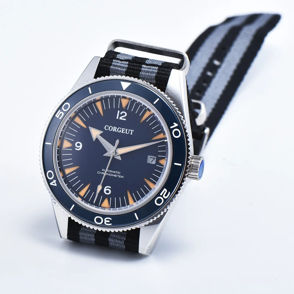 Бренд: Corgeut Механизм: Miyota8215 автоматический механизм Диаметр корпуса: 41 мм без короны Толщина: 15 мм Ширина ремешка: 20 мм Цвет циферблата: синий циферблат Ободок: синий керамический ободок Материал корпуса: корпус из нержавеющей стали 316L Браслет: тканевый ремешок, как показано Переднее стекло: сапфировое стекло Задняя часть корпуса: см. Тип застежки: цветная стальная пряжка Водонепроницаемость: 10 АТМ