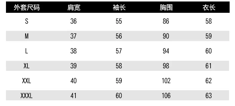 | XXL | 40 | 102 | 62 | 59 | 160-165 | 57-62 |