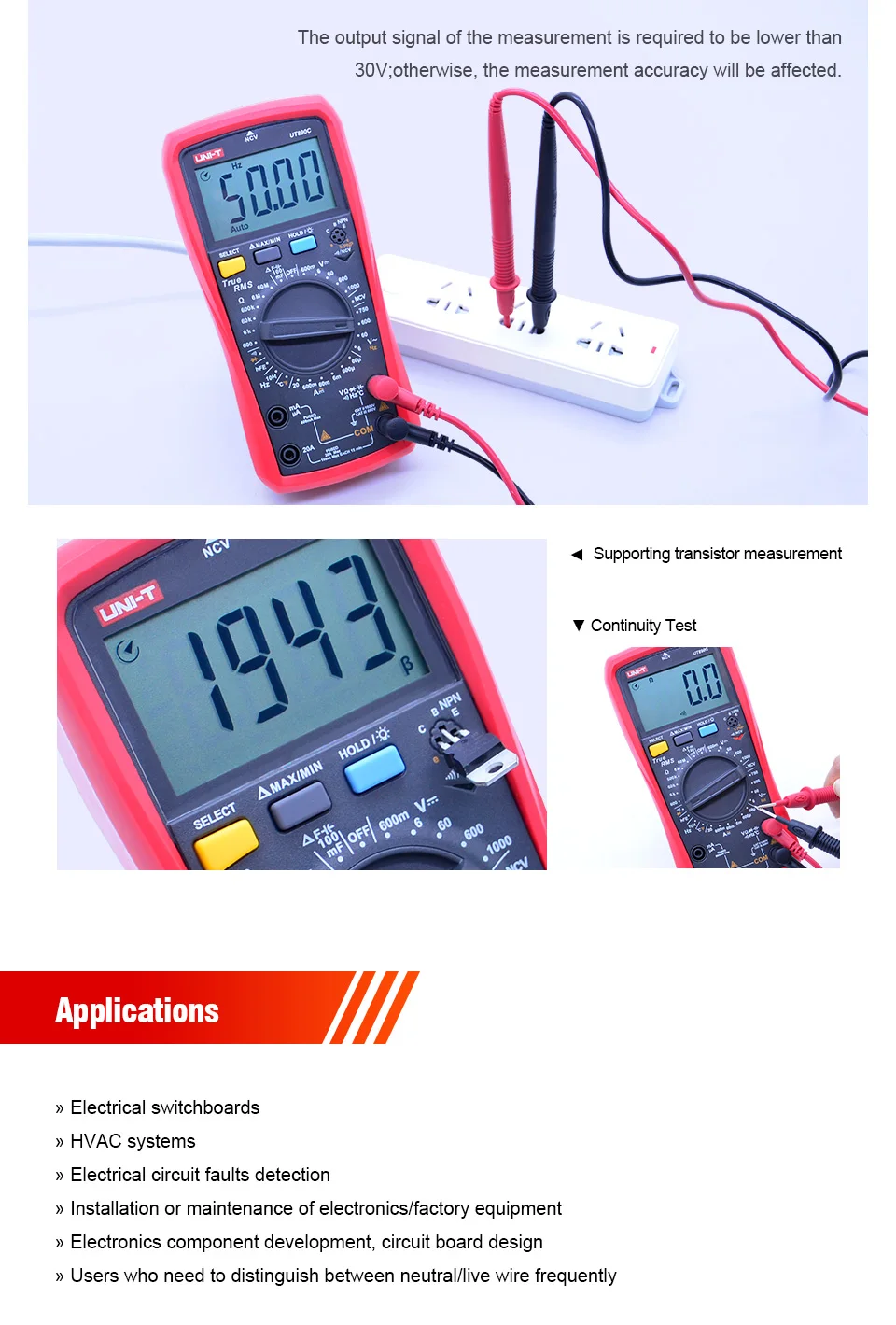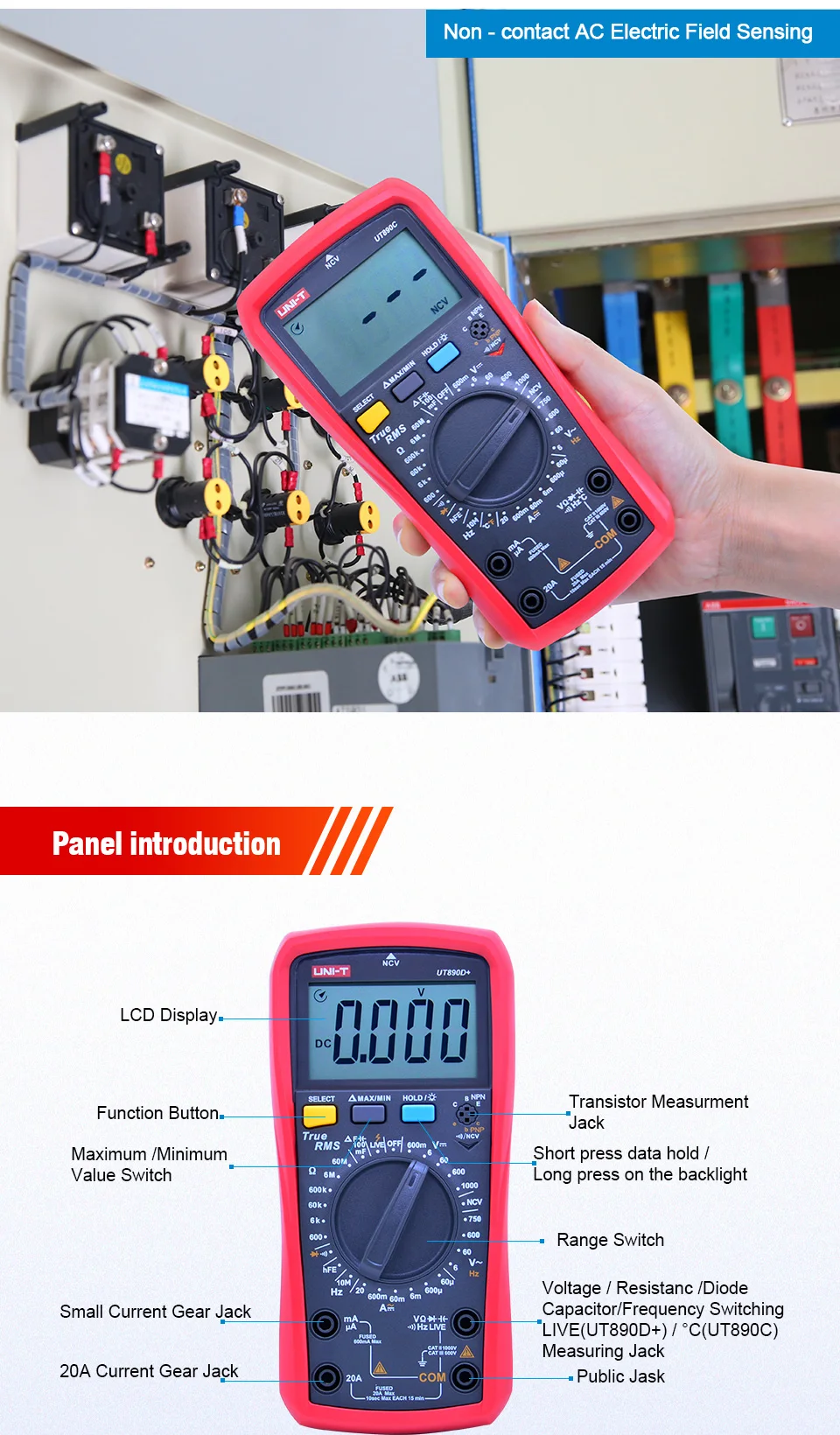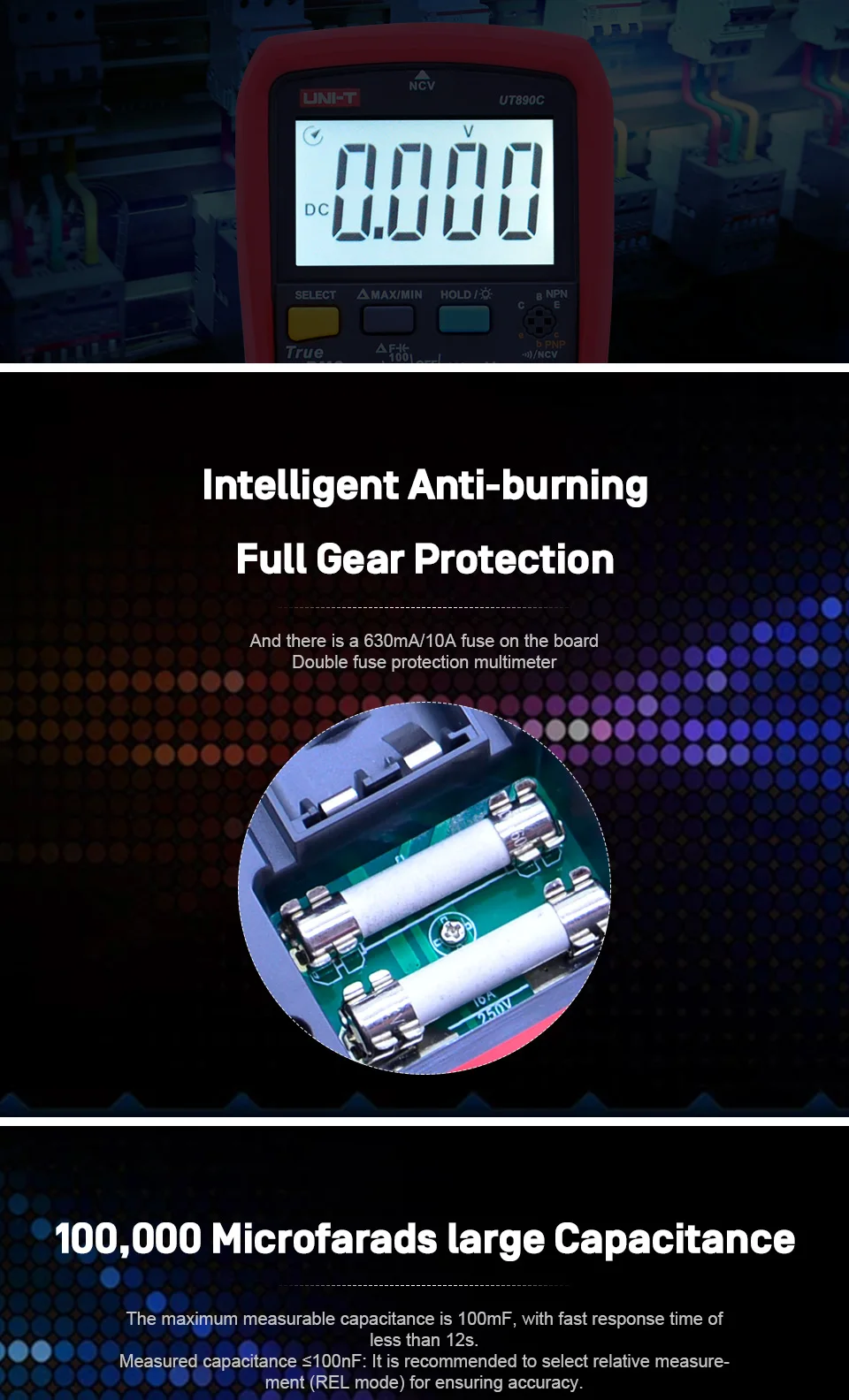 Характеристика: Цифровые мультиметры UT890C/D + 6000-count true RMS разработаны с большим ЖК-дисплеем.| Спецификация | Диапазон | UT890C | UT890D + |