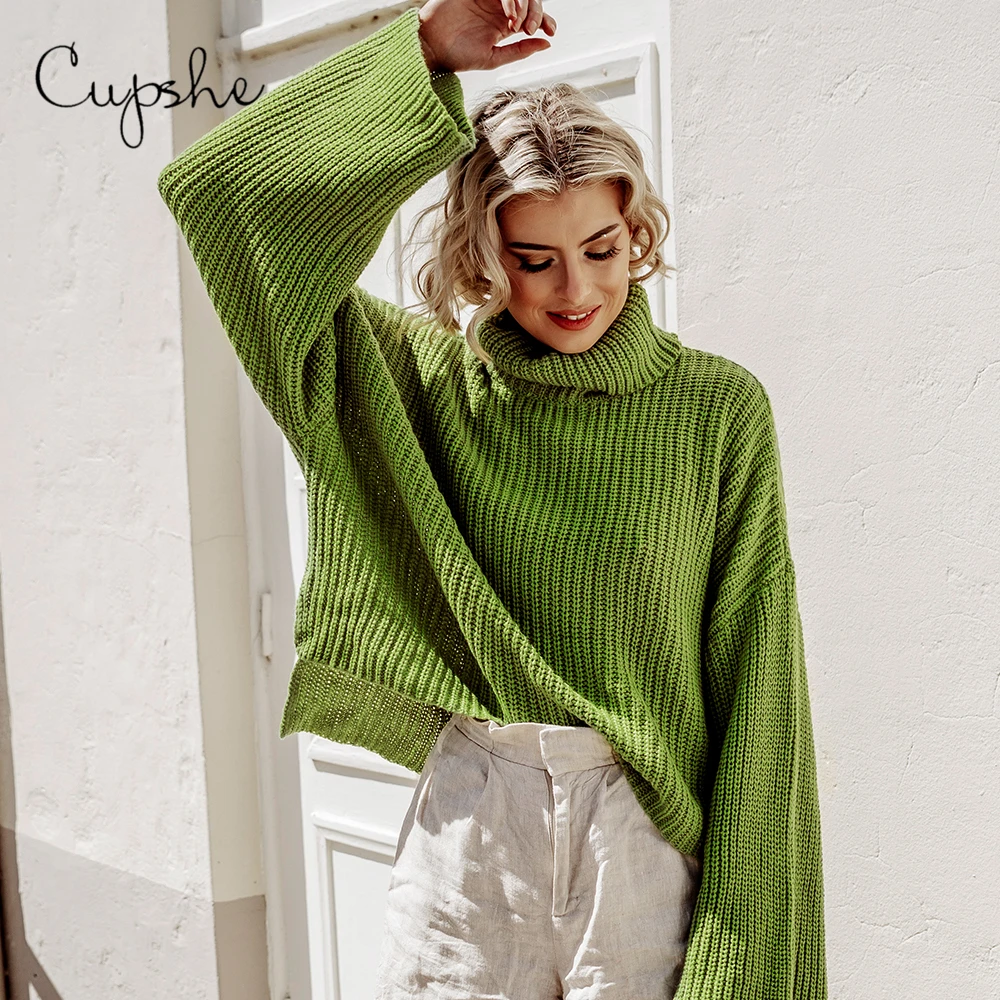 Получите уютный зеленый свитер с высоким воротником. Свободная посадка и рукава-колокольчики делают их очень удобными.