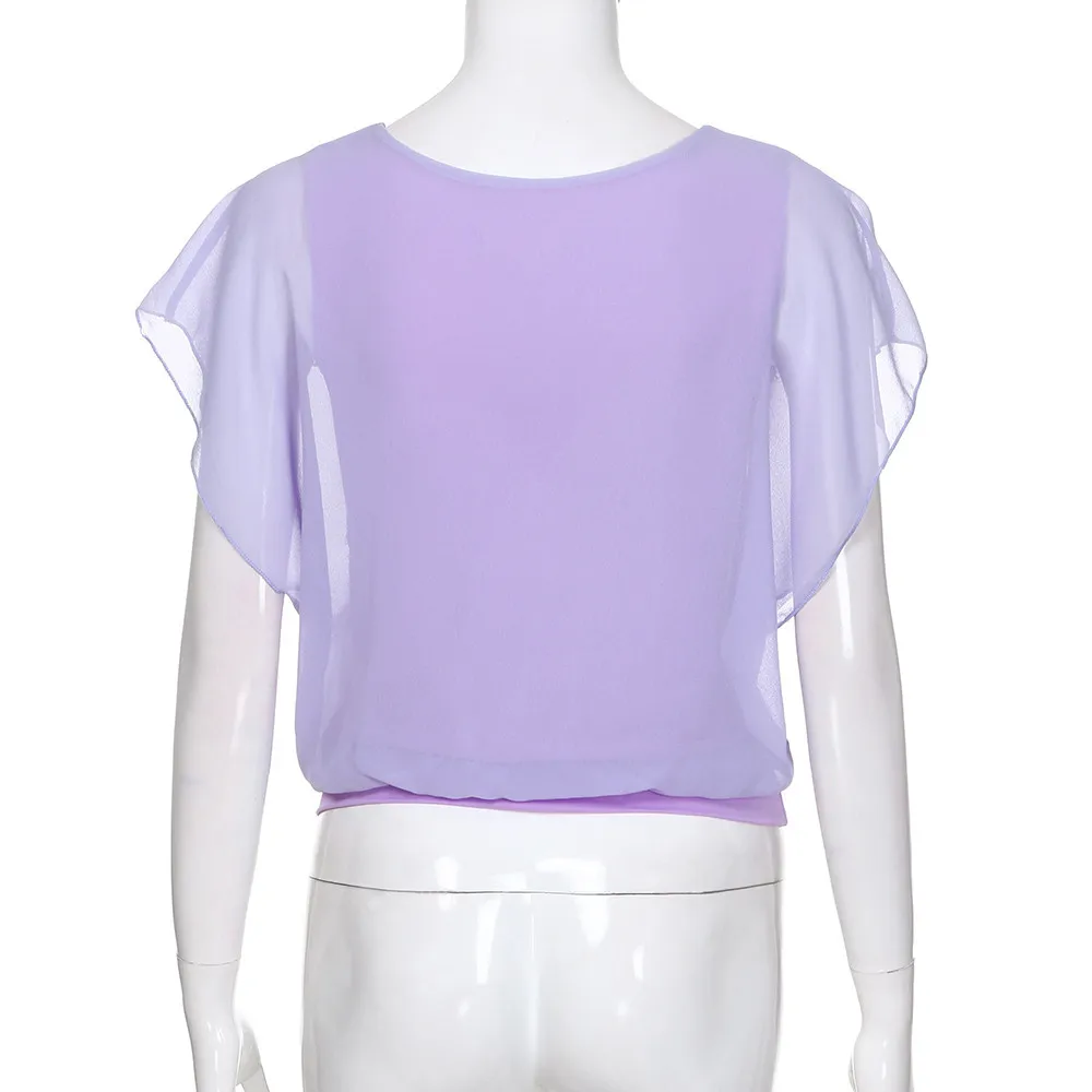 Повседневная шифоновая футболка с короткими рукавами с рукавом «летучая мышь». Очень круто и модно носить на улице, специально для летнего пляжного музыкального фестиваля. Лучше всего сочетать его с шортами и босоножками-гладиаторами.