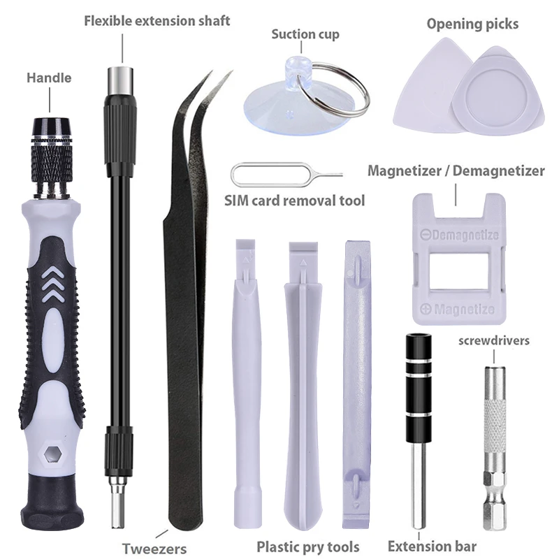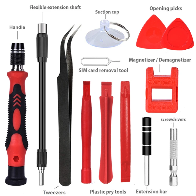 Specification:PH000, PH000, PH00, PH00, PH0, PH0, PH1, PH1, PH2, and PH2M, word, PZO, PZO, PZ1, PZ1, PZ2, and PZ2Straight: 1.0, 1.5, 2.0, 2.5, 3.0, 3.5 and 4.0Straight: 1/16, 5/64, 3/32, 7/64, 1/8, 9/64 and 5/32Five Stars: 0.8, 0.8, 1.2, 1.2, 1.5, 1.5, 2.0 and 2.0Torx: T3, T3, T4, T4, T5, T5, T6, T6, T7, T7, T8, T8, T9, T9, T10,T10, T15, T15, T20, and T20Hexagon: 07, 0.9, 13, 1.3, 1.5, 1.5, 2.0, 2.0, Z5, 2.5, 3.0, 3.0,3.5, 4, 0 and 4.0Hexagon: 1/16, 5/64, 3/32, 7/64, 1/8, 9/64 and 5/32Triangle: 2.0, 2.3, 2.7 and 3.0"U" form: 2.6 and 2.6"Y" shape: 2.0 and 3.04mm socket: M2.5, M3.0, M3.5, M4.0, M4.0, M4.5, M5.0 and M5.5Package Content:1* aluminum alloy handle1* extension bar1* flexible shaft1*tweezer1*SIM card pin1*magnetiser/demagnetizer1*sucker8*pry piece3* crowbar100*screwdriver bitsСм. также другие товары: 8884000321846051, 8884000321846052, 8884000321846054, 8884000321846055