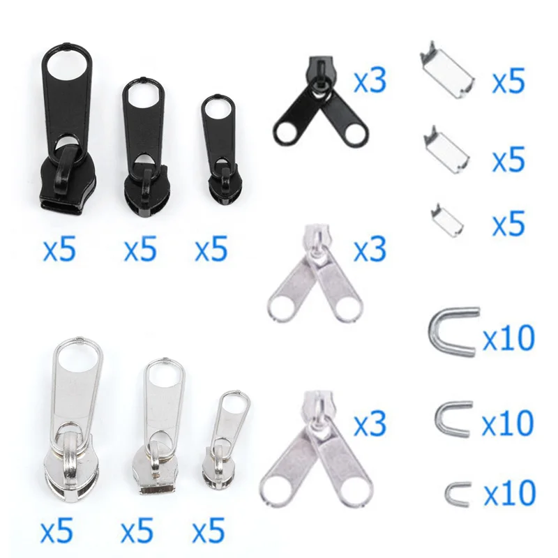Применение: обеспечивает обычно применяемые Сменные ползунки во многих размерах для ремонта одежды, сумок, палаток, пальто, джинсов, курток, кошельков, багажа, рюкзаков.