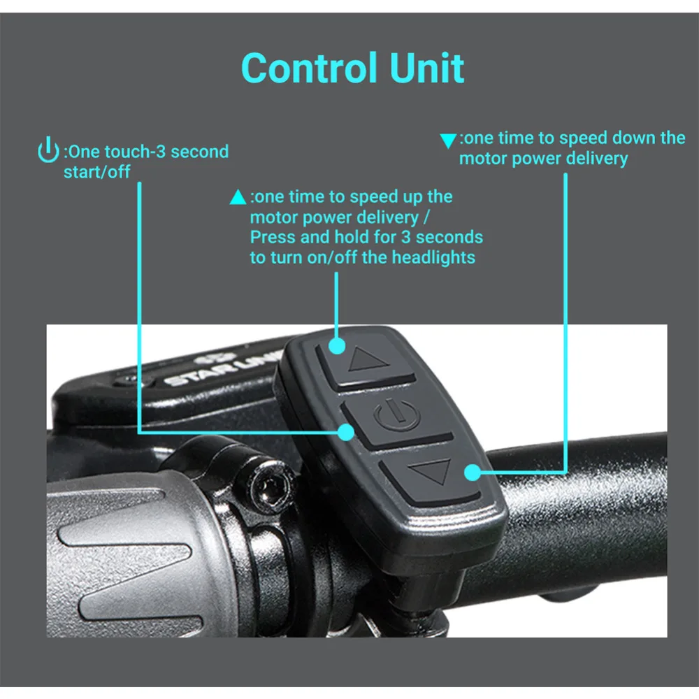 Блок управления: Один раз, чтобы уменьшить мощность двигателя. Одно касание-3 секунды запуск/выключение. Один раз для ускорения доставки питания двигателя/Нажмите и удерживайте в течение 3 секунд включение/выключение фар .