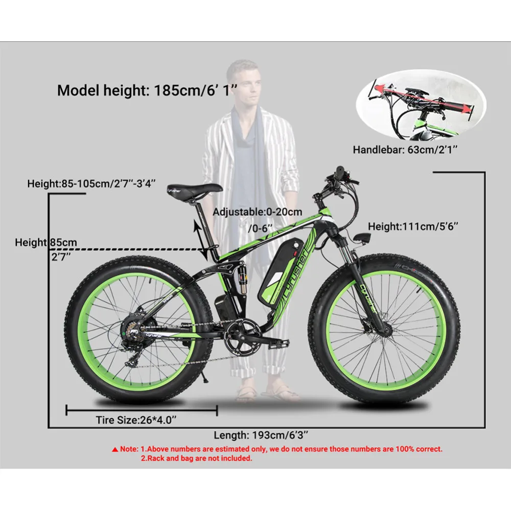 Информация о продукте: 1. 750 Вт (Фактическая мощность может достигать 1500 Вт) 48 в 13 а 2. Бесколлекторный двигатель 3. Выключение давления масла дисковый тормоз 4. Shimano 7 скоростей 5. 5 скоростей смарт-таблицы паролей Спецификация: Вес велосипеда: около 28 кг Рама: 26*17 Шина: Chaoyang 26*4,0 Особенности: Батарея Зарядка через usb Батарея Водонепроницаемая конструкция Транспортное средство Сертификация CE сертификация Максимальная грузоподъемность 150 кг Угол 45 градусов Срок службы 40-80 км 3 для верховой езды режимов Многофункциональный водонепроницаемый мешок Портативный полка