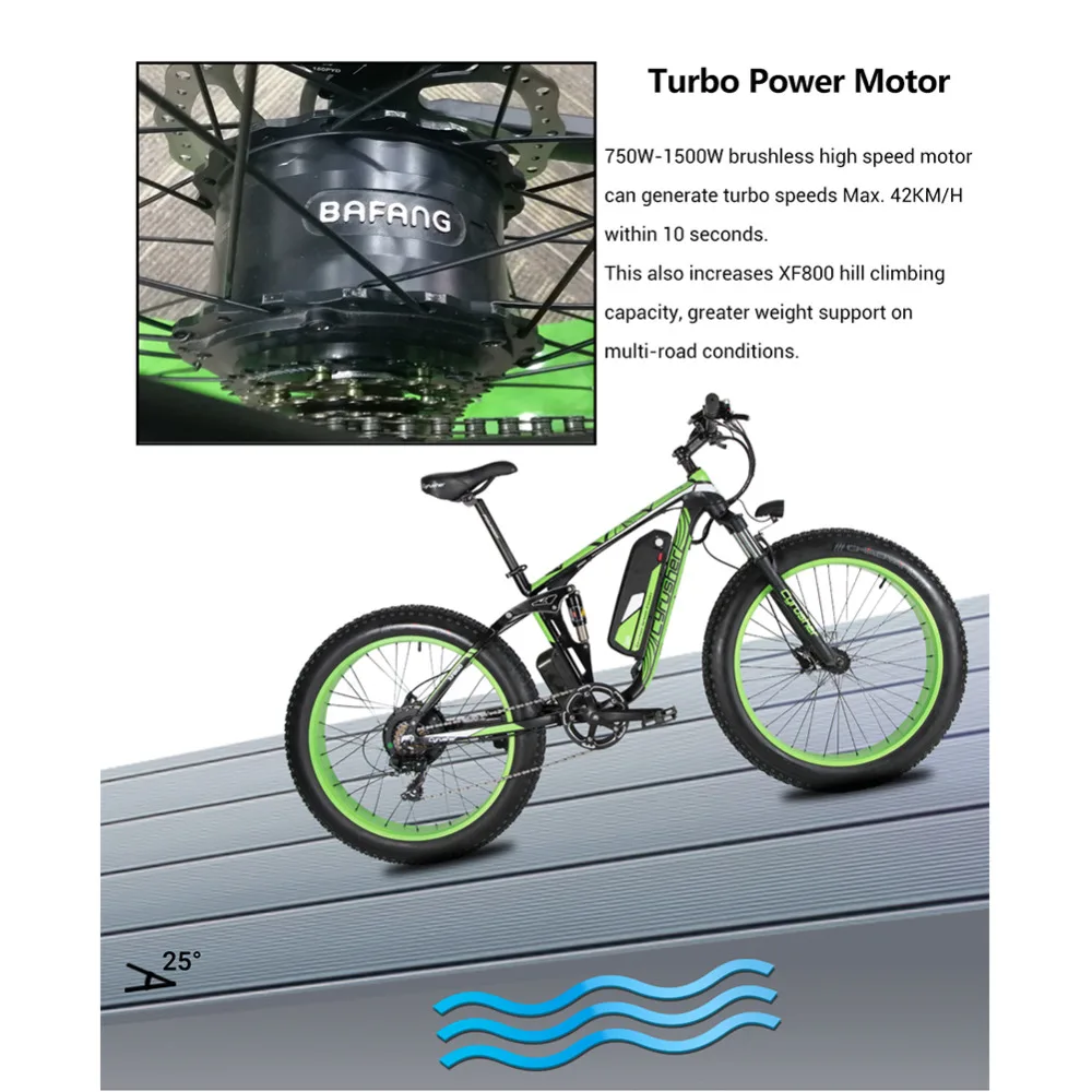 Турбо двигатель большой мощности 750 Вт-1500 Вт бесщеточный высокоскоростной двигатель может генерировать турбо скорости Макс. 42 км/ч в течение 10 секунд. Это также увеличивает XF800 способность скалолазания, большую поддержку веса на условиях мульти-дороги.