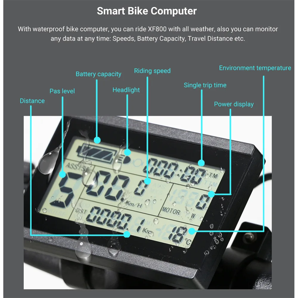 Смарт-компьютер для велосипеда С водонепроницаемым велосипедным компьютером, вы можете кататься на XF800 при любой погоде, также вы можете контролировать Любые данные в любое время: 1. При езде в быстром темпе скорости 2. Температура окружающей среды 3. Объем перезаряжаемого аккумулятора 4. Время одной поездки 5.Pas уровня 6. Все гольфкарты оснащены 7. Индикатор питания 8. Расстояние