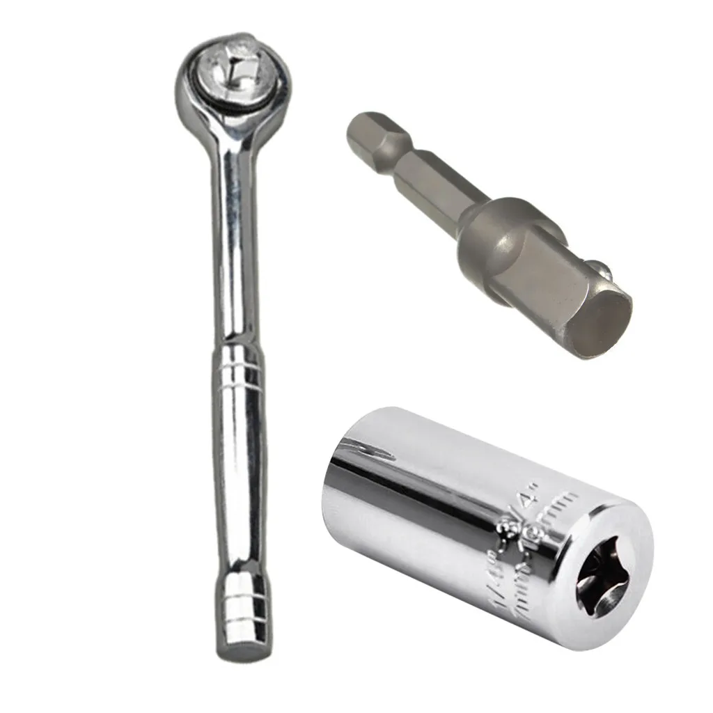 В Может вместить гайку и болты стандартного размера между 1/4-3/4 дюймов Дюйм, вместе с гайками и болтами метрического размера между 7 мм-19 мм. В Посылка поставляется с трещоткой, адаптером сверла и Разъем.
