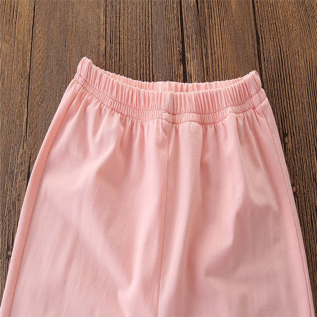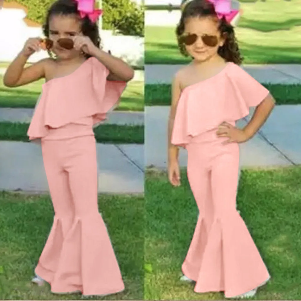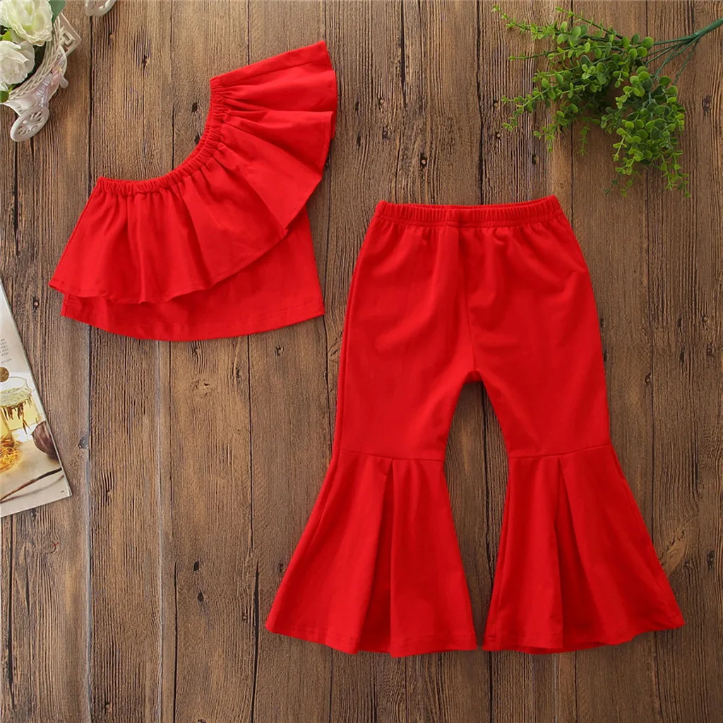 Детская одежда Однотонный топ на бретелях с оборками и открытыми плечами для девочек; Длинные расклешенные штаны; Комплект одежды