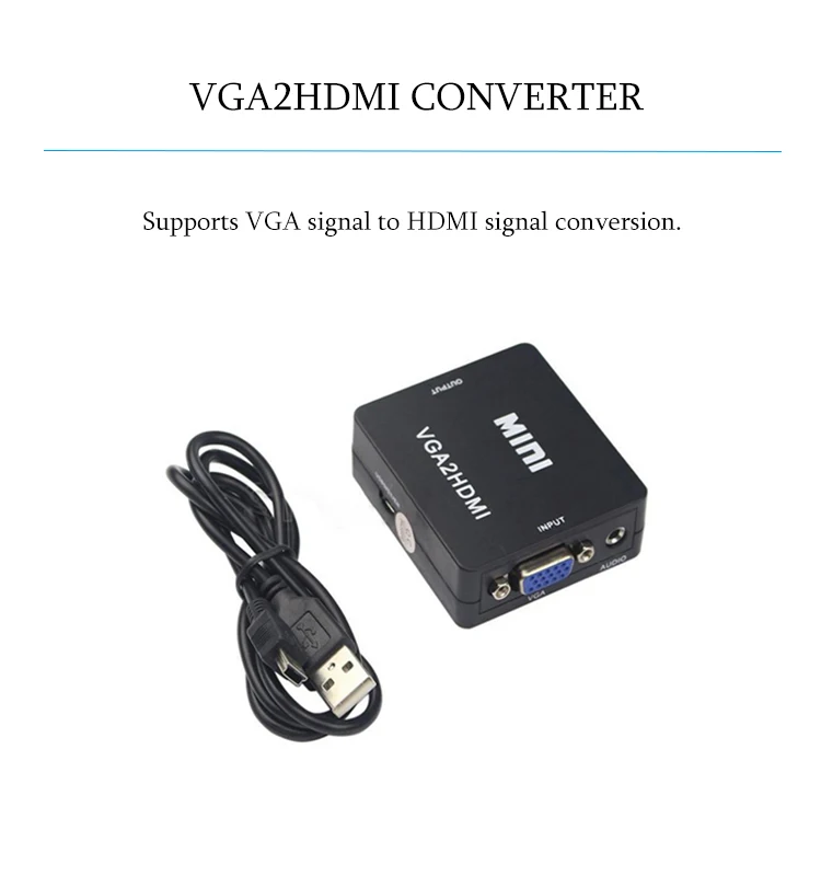 Он используется для преобразования VGA видео и 3,5 мм аналогового аудиосигнала в вашем компьютере в сигнал HDMI и отображения его на большом экране HDTV. Особенности: 1. Нет необходимости устанавливать диски, подключать и играть. 2. Питание от USB кабеля напрямую (входит в посылка), прост в использовании. 3. Выход tha Аудио Синхронизация с видео. 4. Поддержка hdtv с разрешением до 1080 p. 5. Питание от USB или 5 В для адаптера постоянного тока, низкое энергопотребление. 6. Применяется: компьютер ПК, ноутбук, DVD с интерфейсом VGA дисплейных устройств, таких как подключение с интерфейсом HDMI. Упаковочный лист: 1 * VGA2HDMI адаптер 1 * USB кабель питания Примечание: Этот адаптер VGA2HDMI не может поддерживать двунаправленный вариант.