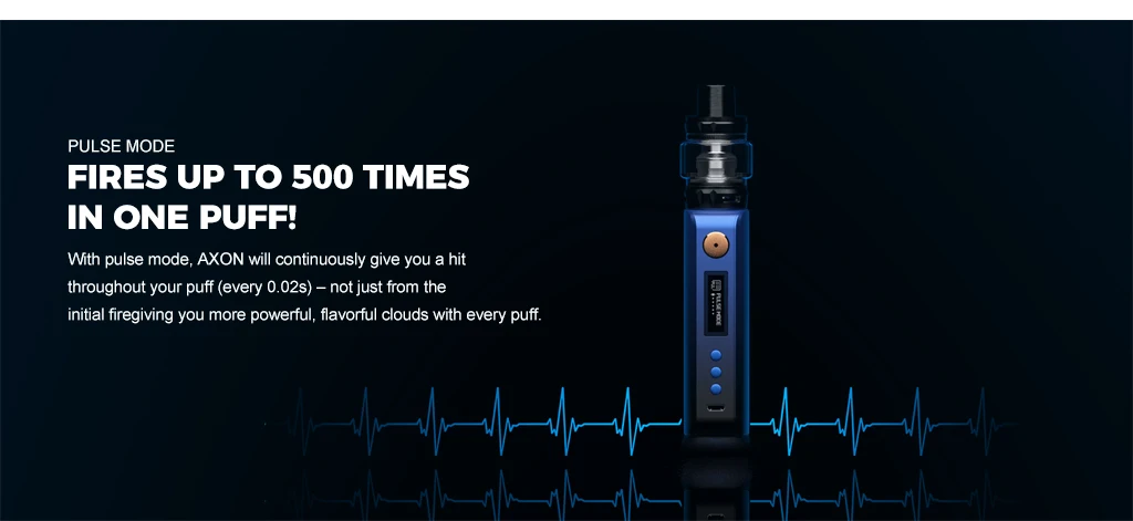 All-new Axon chipset Innovative PULSE mode and SMART TC mode Lightweight with powerful 220W 2.5A fast charging system Improved secondary air flow distribution for richer flavor Easy top screw-up refill design Bullet-shaped coil preventing spit back Advanced QF coil with improved coil structure Widely compatible with GT coils 8ml large e-juice capacity