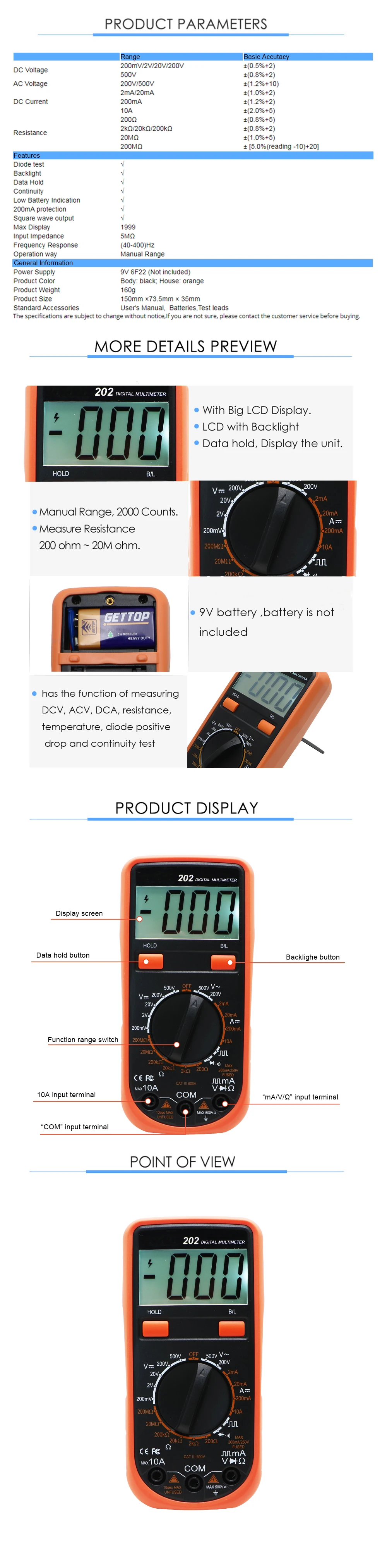 Обычные местные деликатесы 1. Максимальное напряжение составляет 500 В среднеквадратичного значения между входной клеммой напряжения и заземлением. 2. Клемма 10 А: без предохранителя. 3.MA конечный предохранитель: φ 5 × 20 мм 250 мА/в 4. Переключатель диапазона: ручной 5. Функция подсветки: ручное включение и выключение 6. Максимальное Отображение: 1999, обновление 2 ~ 3 раза в секунду. 7. Отображение полярности: Входное отображение отрицательной полярности. 8. Отображение по большей дальности: 1. 9. Функция хранения данных: Левая нижняя часть ЖК-дисплея отображает H. 10. Низкий заряд батареи: ЖК-дисплей отображает символ. 11. Встроенный аккумулятор: 9 В NEDA1604 /6F22 /006P. 12. Рабочая температура: 0 ℃ ~ 40 ℃ ( 32 ℉ ~ 104 ℉) 13. Температура хранения: - 10 ℃ ~ 50 ℃ (14 ℉ ~ 122 ℉) 14. Размеры: 150 мм × 73,5 мм × 35 мм. 15. Вес брутто: приблиз. 156 г (включая батарею)