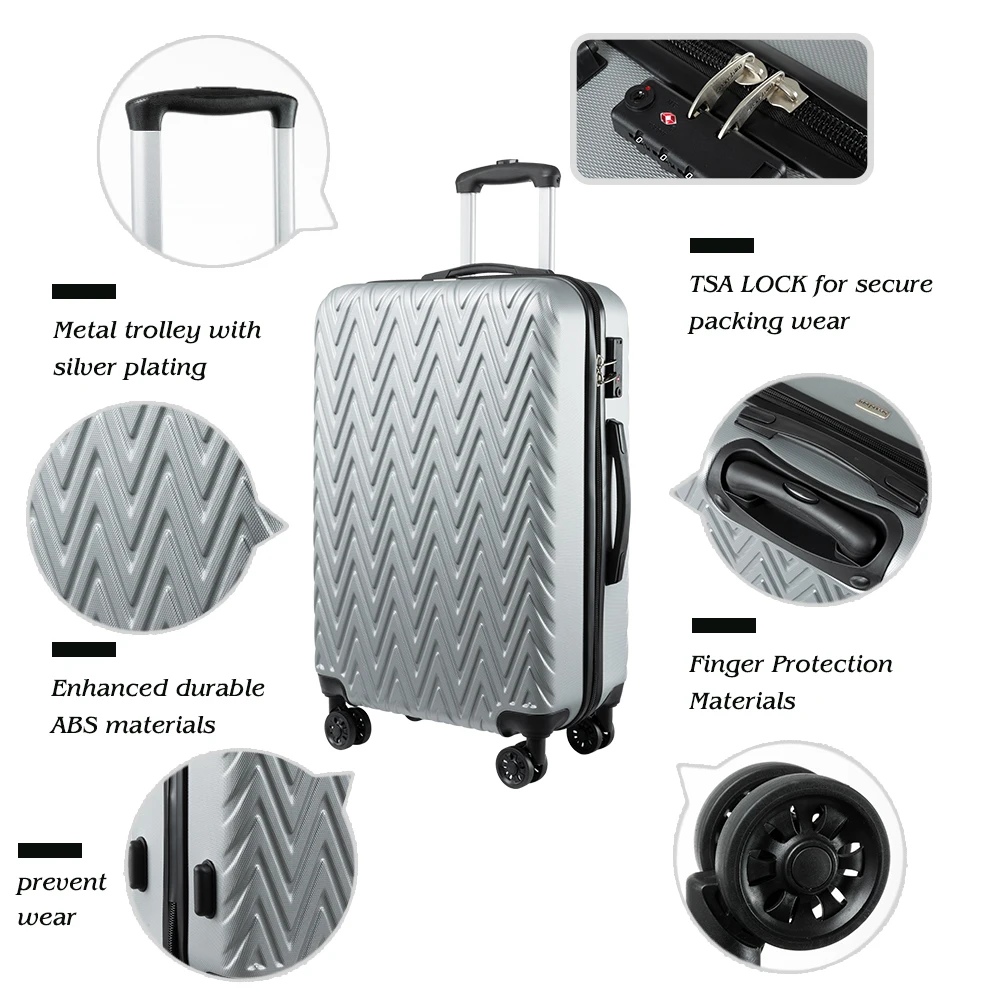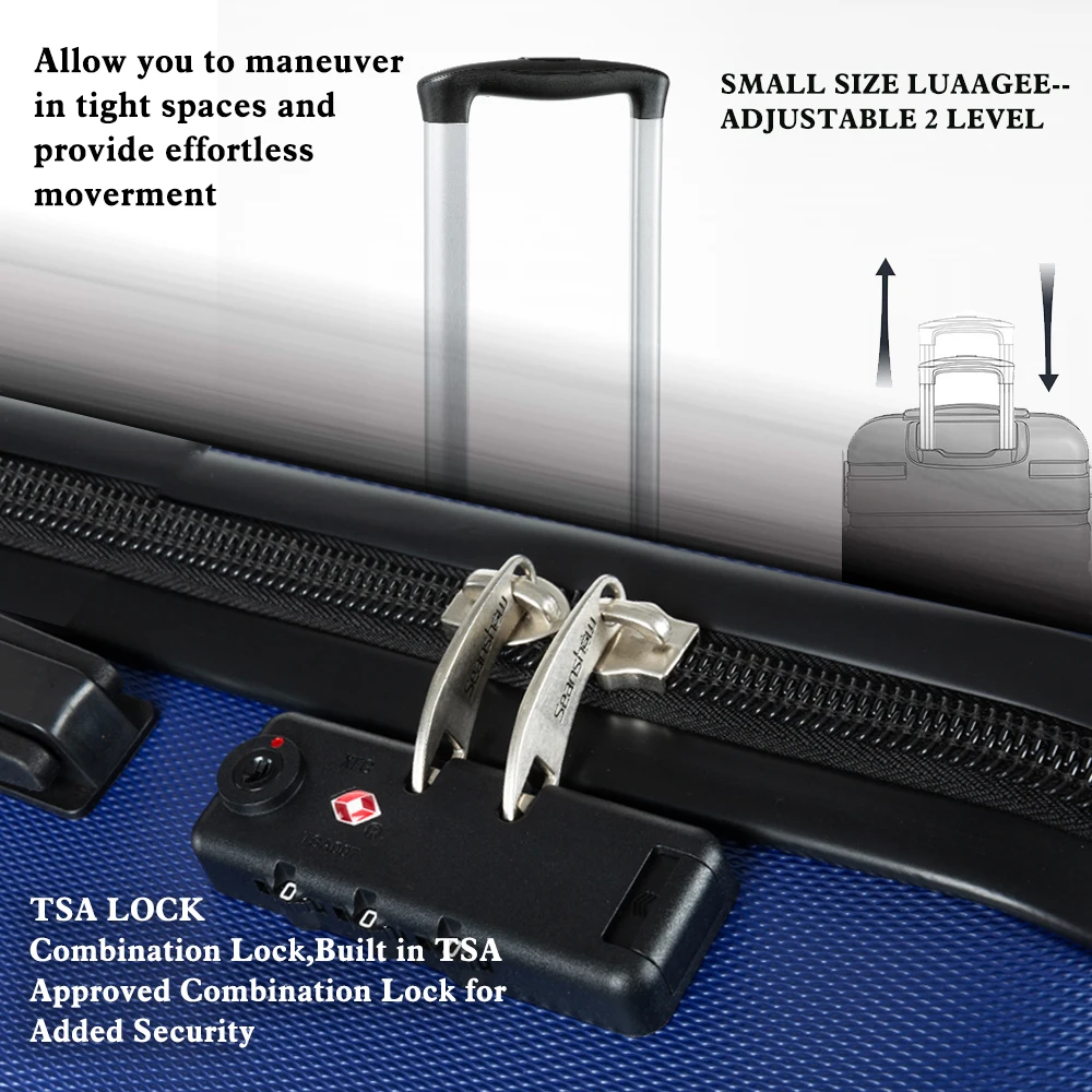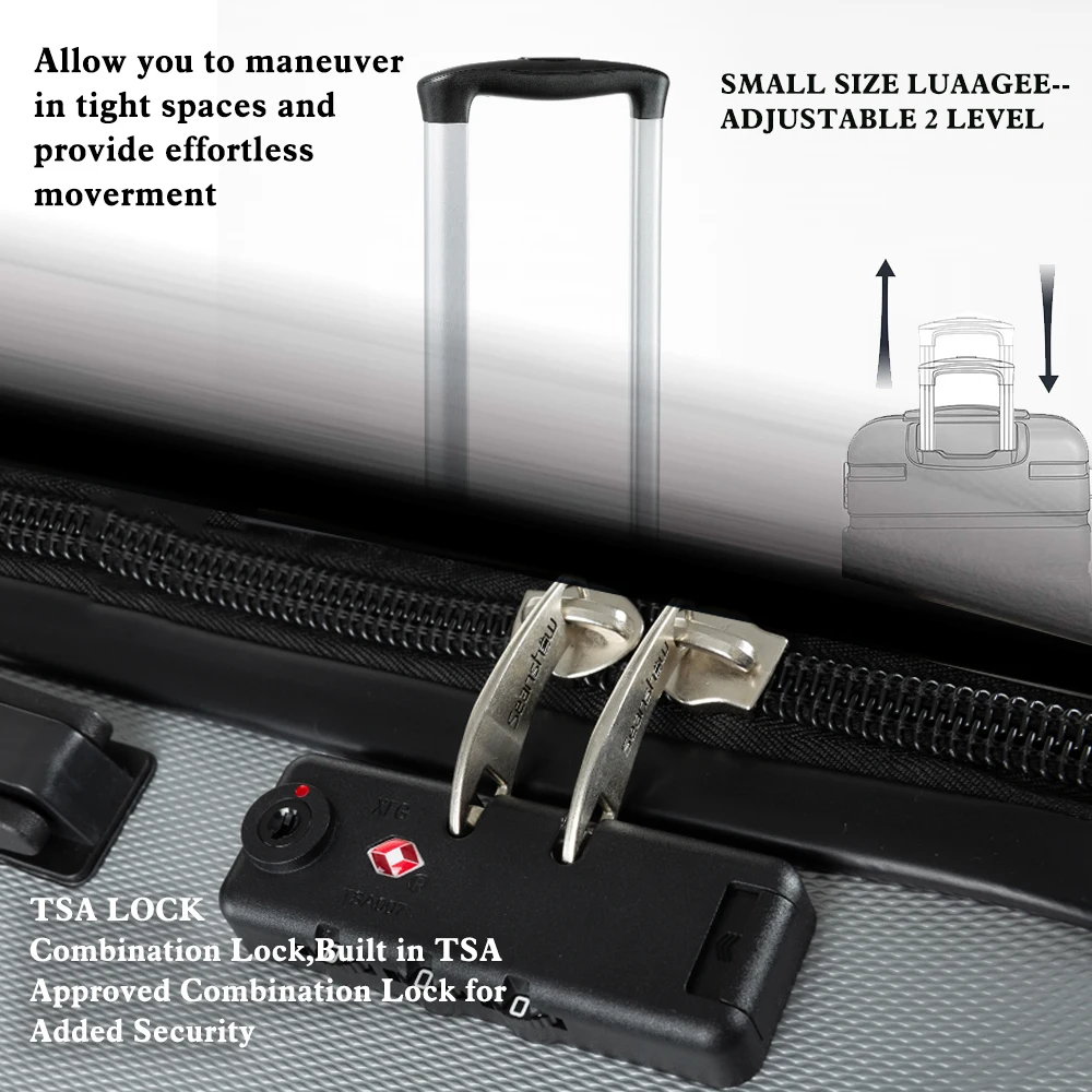 ABS материал-прочный и легкий жесткий корпус/Устойчивый к царапинам матовый и внешний, долго идеально протестирован техником-сильная устойчивость к стрессу, нетоксичный, водонепроницаемый 2 года гарантии. Благодаря встроенному замку TSA вы можете убедиться, что ваши ценные вещи в безопасности и безопасности. Дизайн колеса позволяет поворачивать светильник на 360 градусов, что обеспечивает легкий ход; многоступенчатая кнопочная фиксирующая ручка для удобной регулировки для любого размера путешественника. Хорошо оборудованный интерьер имеет большое пространство для упаковки, сетчатые карманы и сумки для переноски, встроенные, чтобы помочь лучше организовать предметы первой необходимости и держать ваше содержимое на месте и в порядке во время транспортировки. 10 # Взрывозащищенная молния-высокая прочность 10 # молния, больше одежды, не волнуйтесь