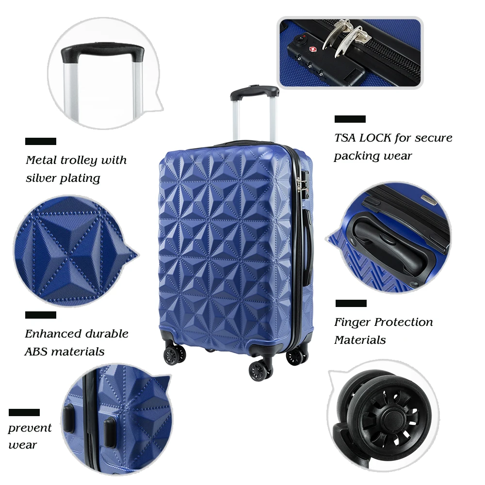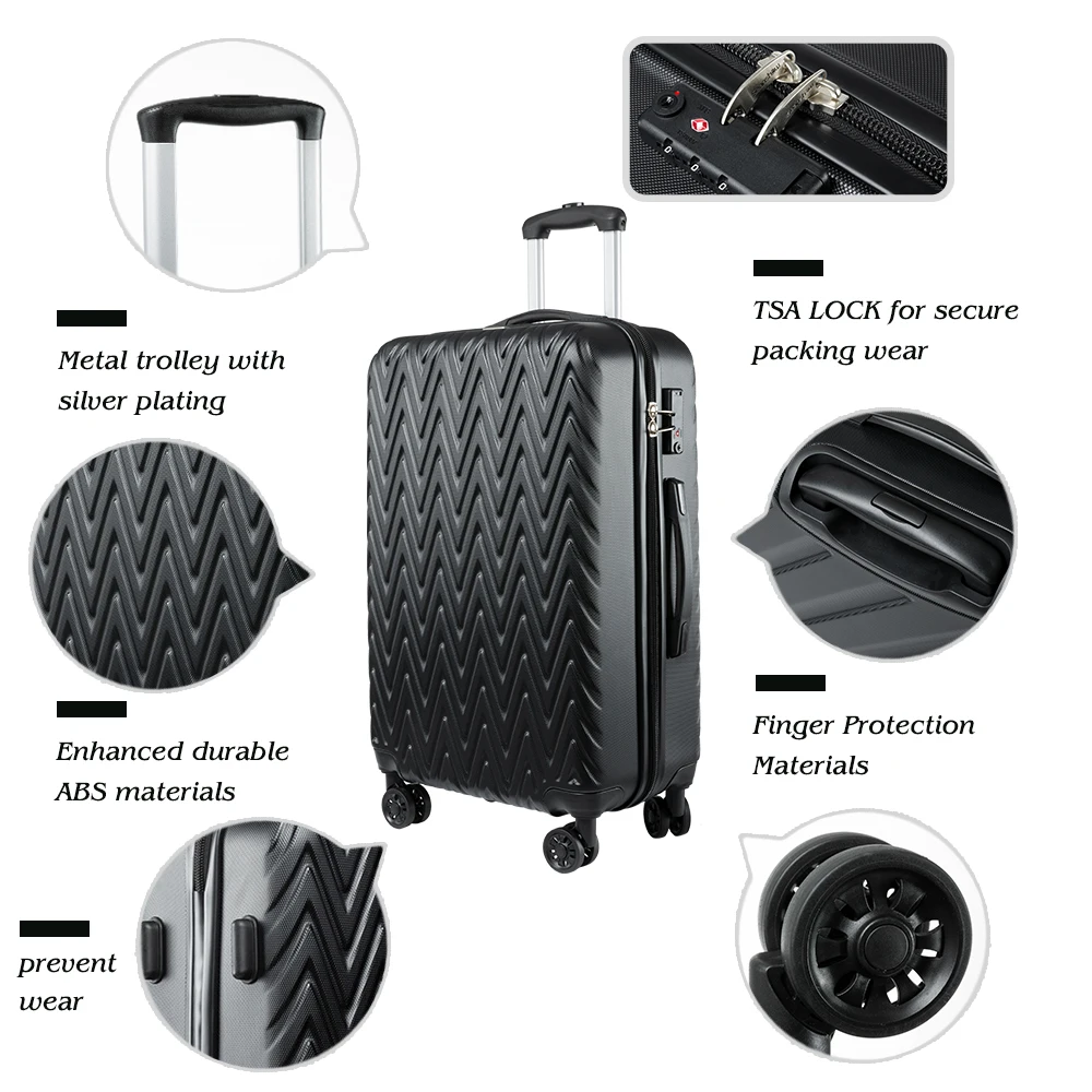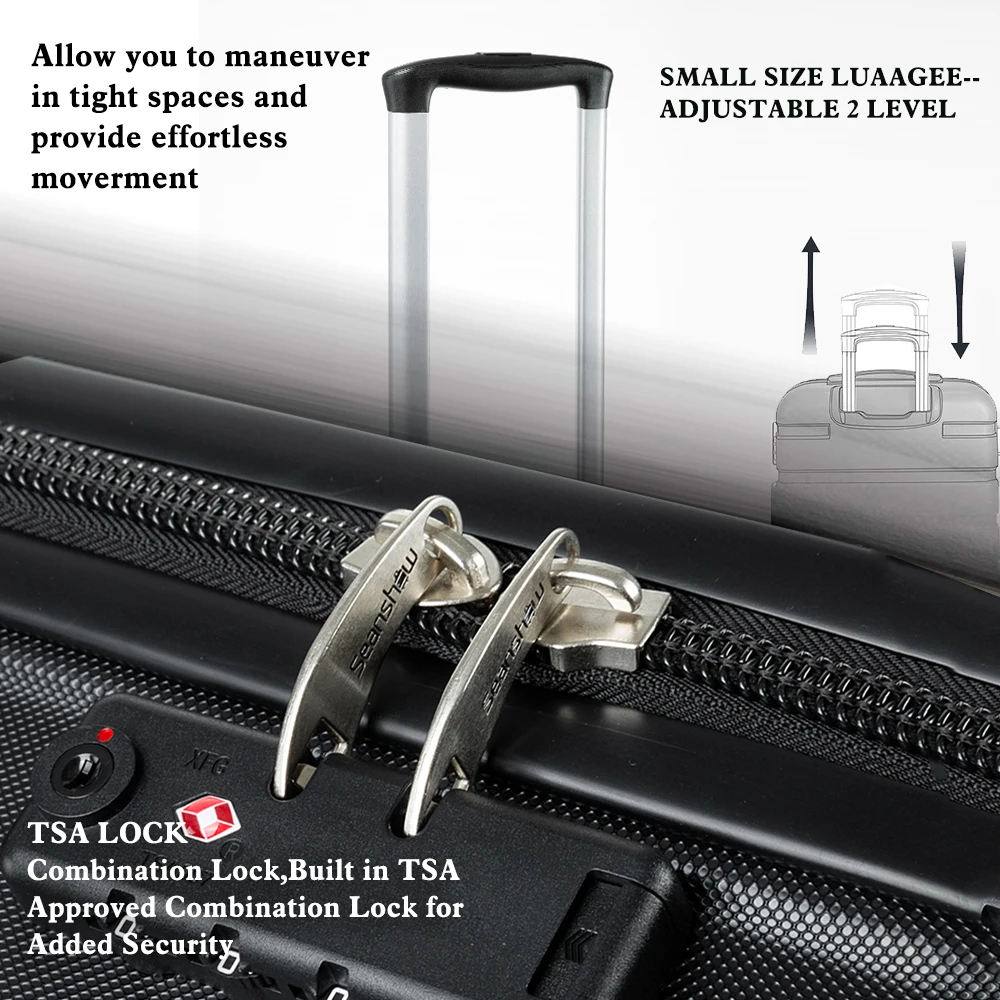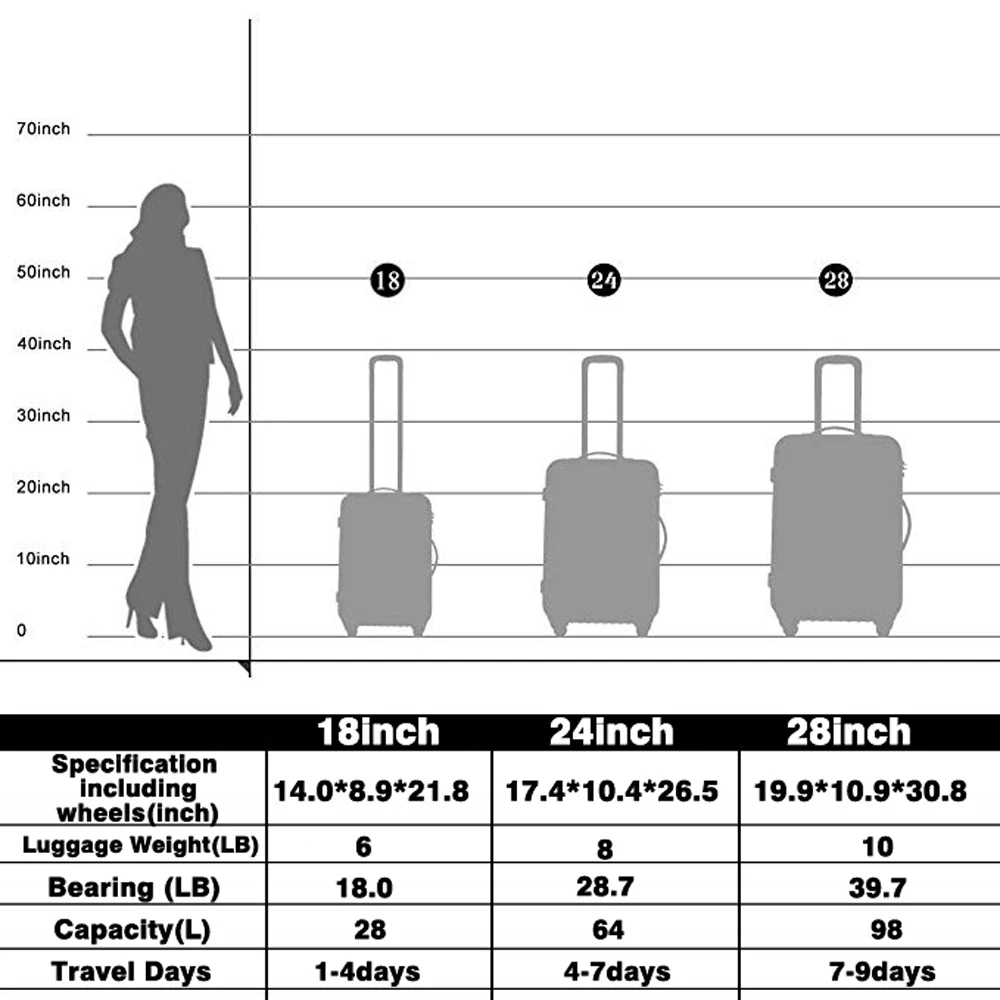 ABS материал-прочный и легкий жесткий корпус/Устойчивый к царапинам матовый и внешний, долго идеально протестирован техником-сильная устойчивость к стрессу, нетоксичный, водонепроницаемый 2 года гарантии. Благодаря встроенному замку TSA вы можете убедиться, что ваши ценные вещи в безопасности и безопасности. Дизайн колеса позволяет поворачивать светильник на 360 градусов, что обеспечивает легкий ход; многоступенчатая кнопочная фиксирующая ручка для удобной регулировки для любого размера путешественника. Хорошо оборудованный интерьер имеет большое пространство для упаковки, сетчатые карманы и сумки для переноски, встроенные, чтобы помочь лучше организовать предметы первой необходимости и держать ваше содержимое на месте и в порядке во время транспортировки. 10 # Взрывозащищенная молния-высокая прочность 10 # молния, больше одежды, не волнуйтесь