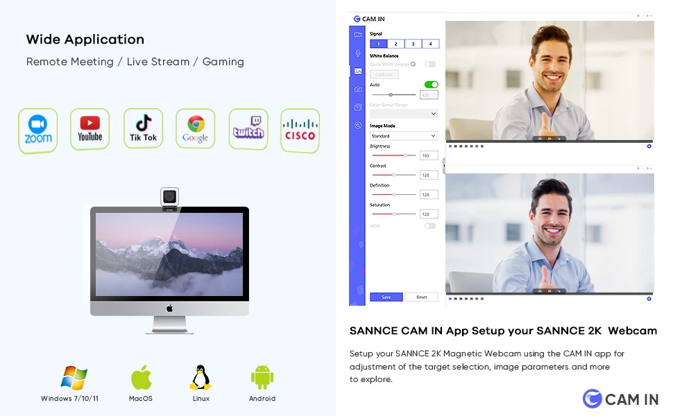 [Веб-камера 2K с автофокусом] Эта веб-камера USB предназначена для профессионального качества видео при плавном 30 fps (2K 4MP) или 60 fps (1080p) с автоматическим освещением, регулировка цвета и яркости. Автоматическая регулировка фокусного расстояния и широкий угол крышки с 90 ° FoV без искажений.
