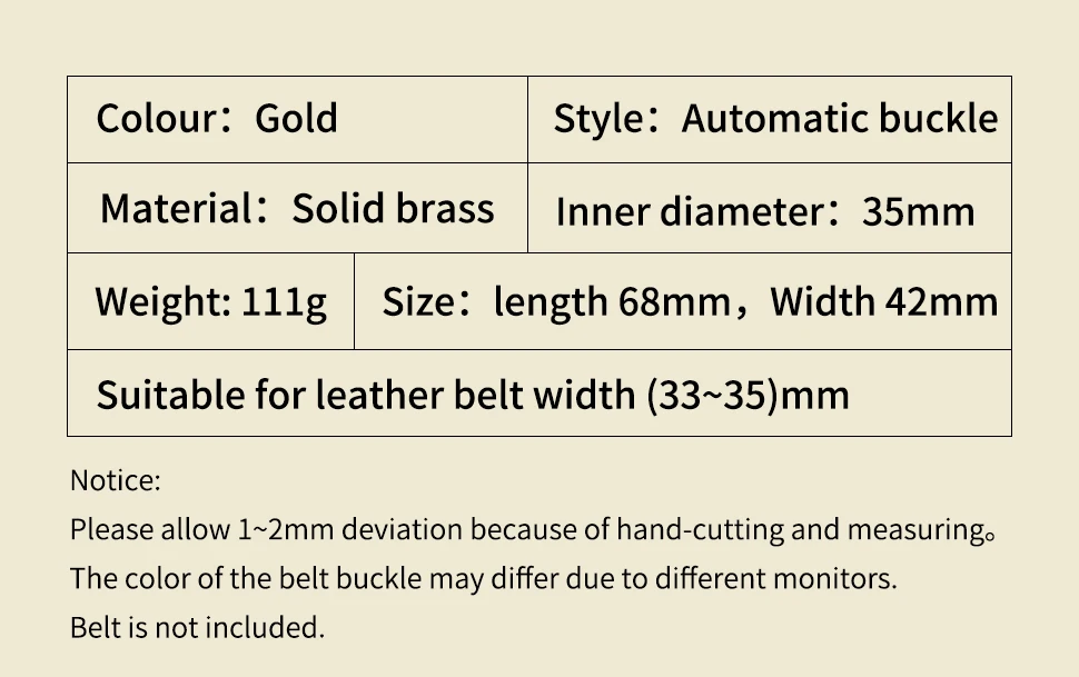 Уважаемый покупатель, мы принимаем Розничные, оптовые, прямые поставки. Надеюсь, вам понравится наш сервис, спасибо всем покупателям. Подробная информация о продукте Цвет: золотистый Стиль: Автоматическая пряжка Материал: твердая латунь Вес: 111 г Размер: Длина 68 мм, ширина 42 мм, внутренний диаметр 35 мм. Подходит для кожаного ремня шириной 33-35 мм. Обратите внимание: Возможны отклонения в 1-2 мм из-за ручного резания и измерения. Цвет пряжки ремня может отличаться из-за различных мониторов. Пояс не прилагается.